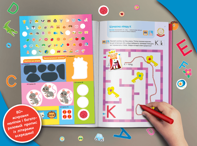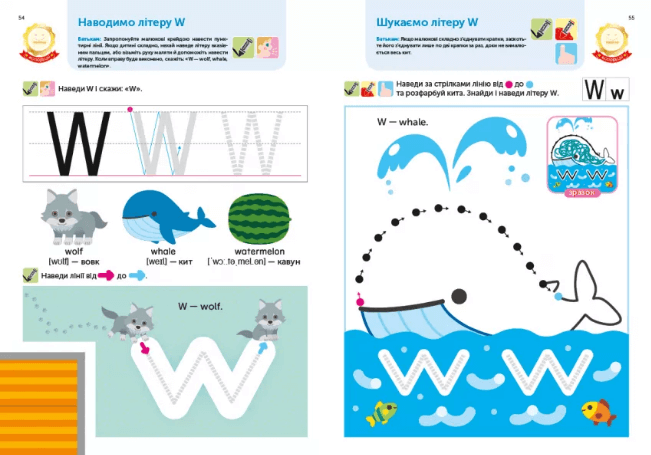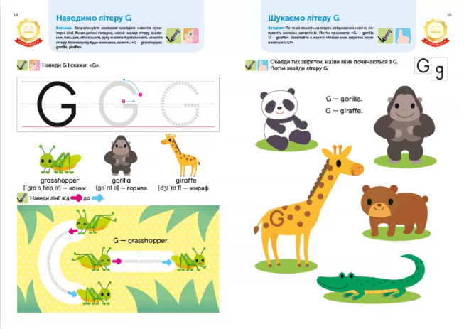Веселі вправи готують до перших кроків у читанні, вчать розпізнавати великі та малі літери, дитина практикується їх відрізняти і співвідносити.