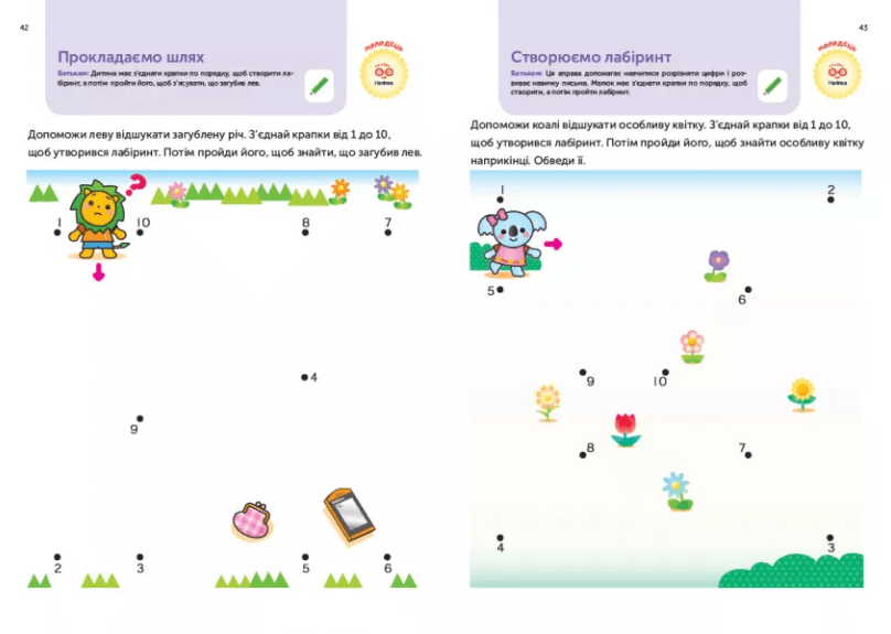 Працюючи з цією книжкою, дитина попрактикується наводити лінії і контури, розфарбовувати, з’єднувати крапку за крапкою, опанує ігри з числами, проходження лабіринтів. Веселі вправи легко розвинуть уважність, дрібну моторику і підготують до школи!