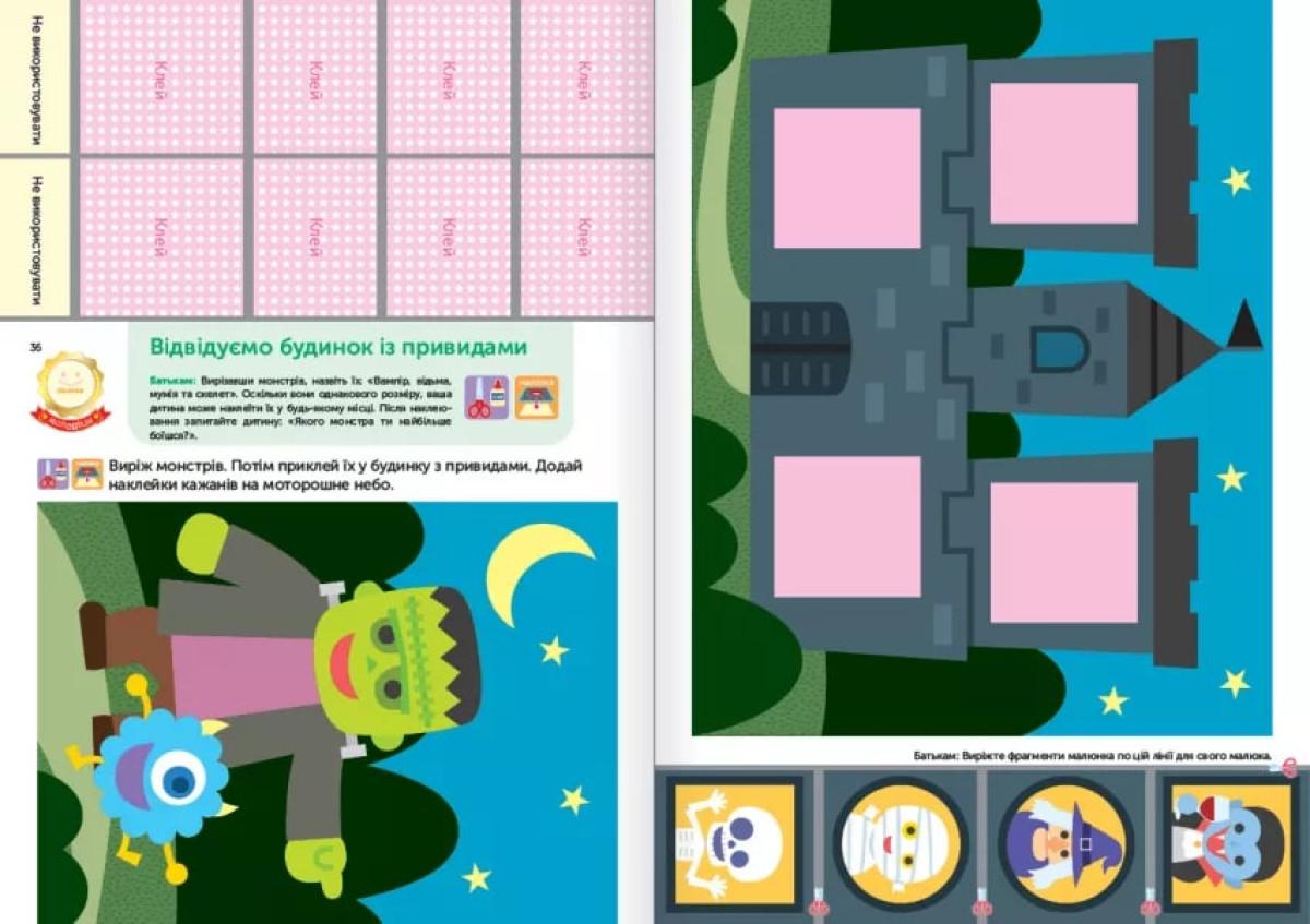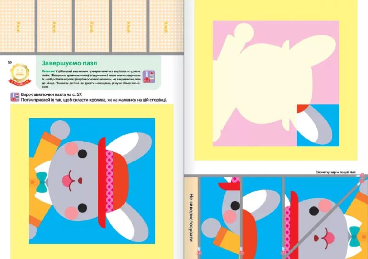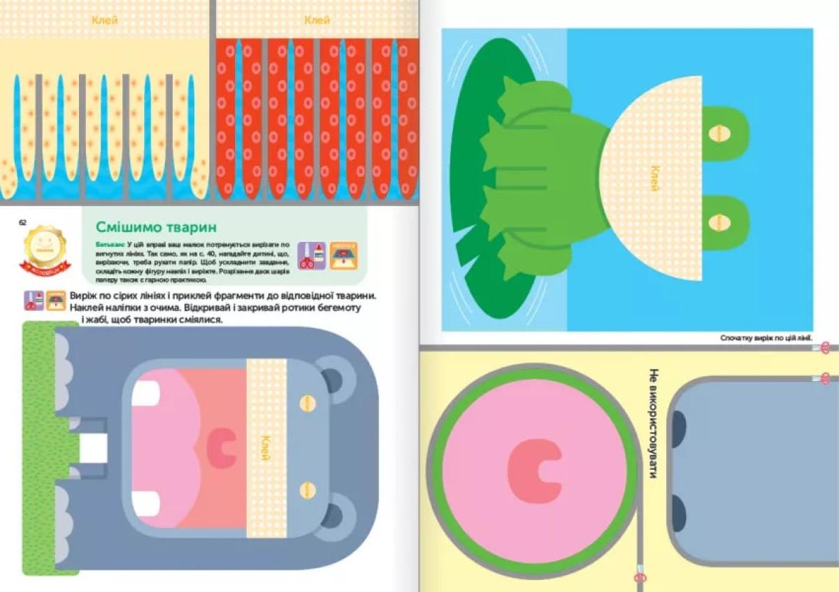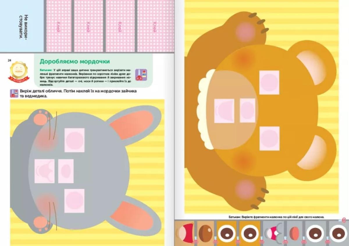 Виконуючи веселі вправи, з яких складається книжка, малюк бавитиметься і водночас вчитиметься правильно тримати ножиці, клей-олівець та маніпулювати ними.