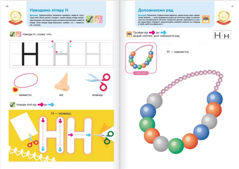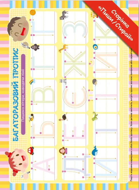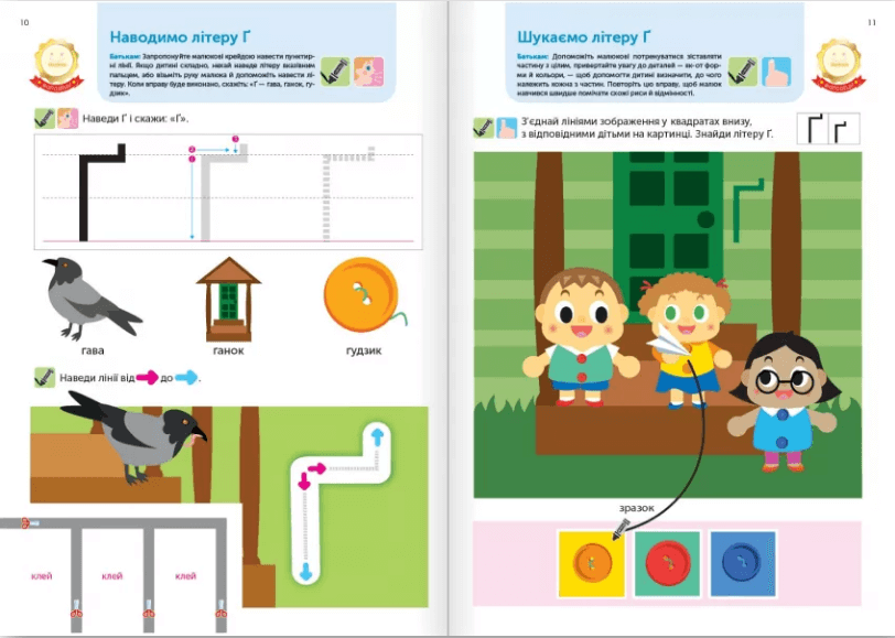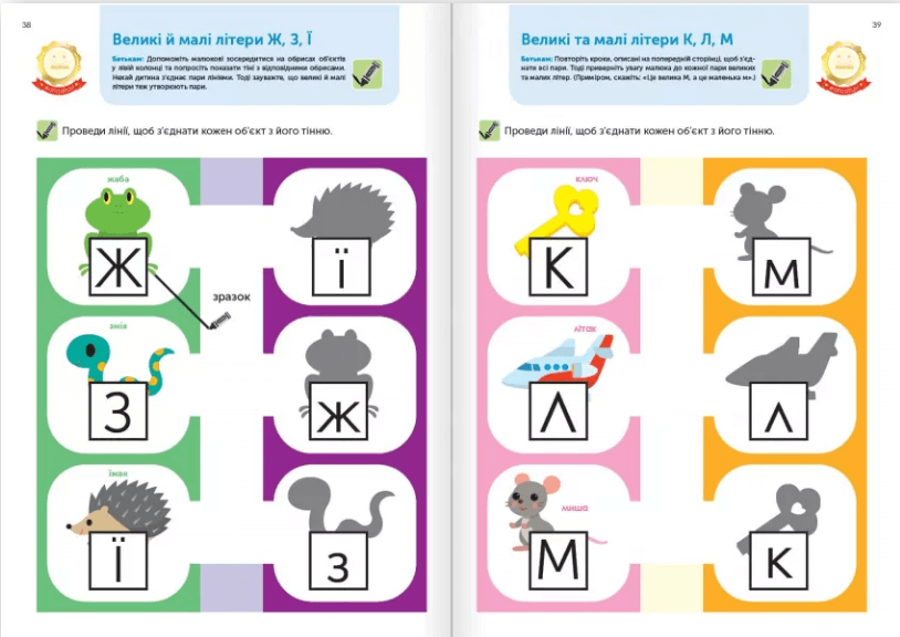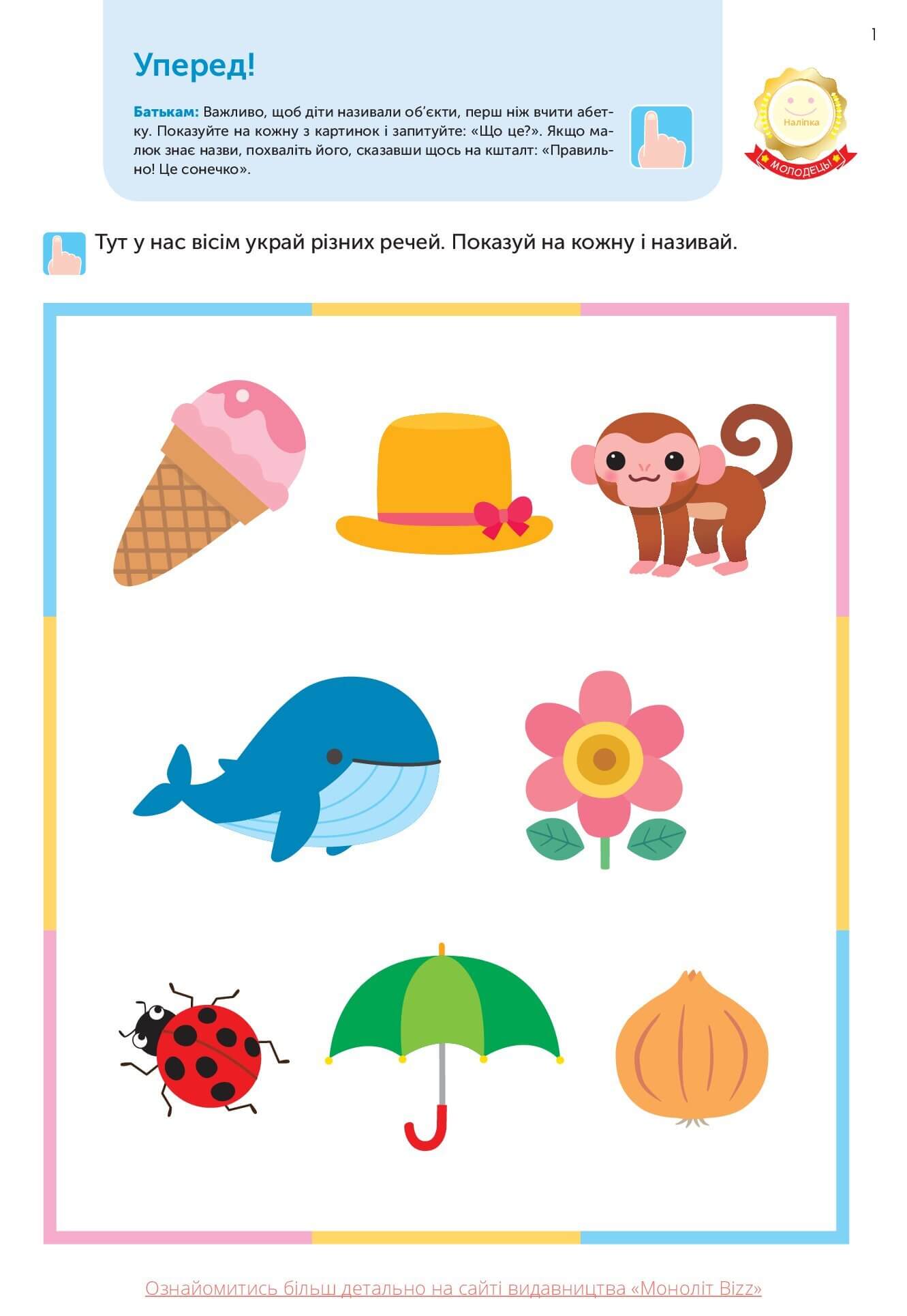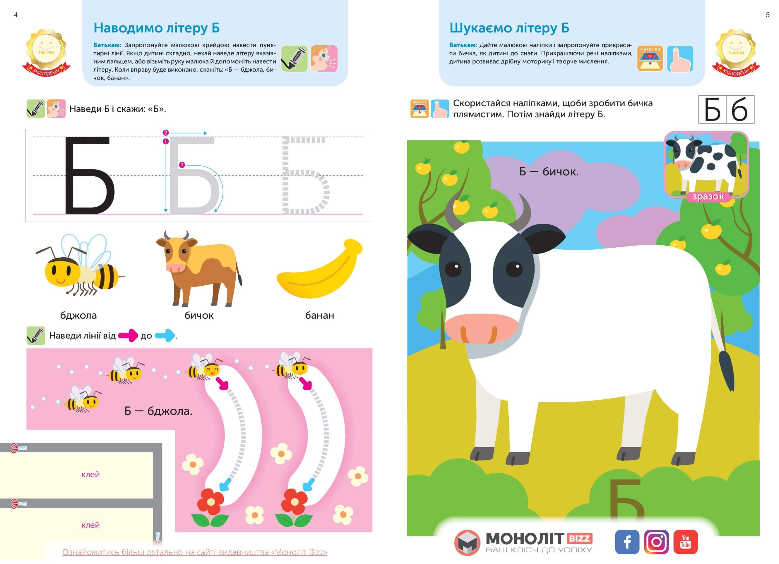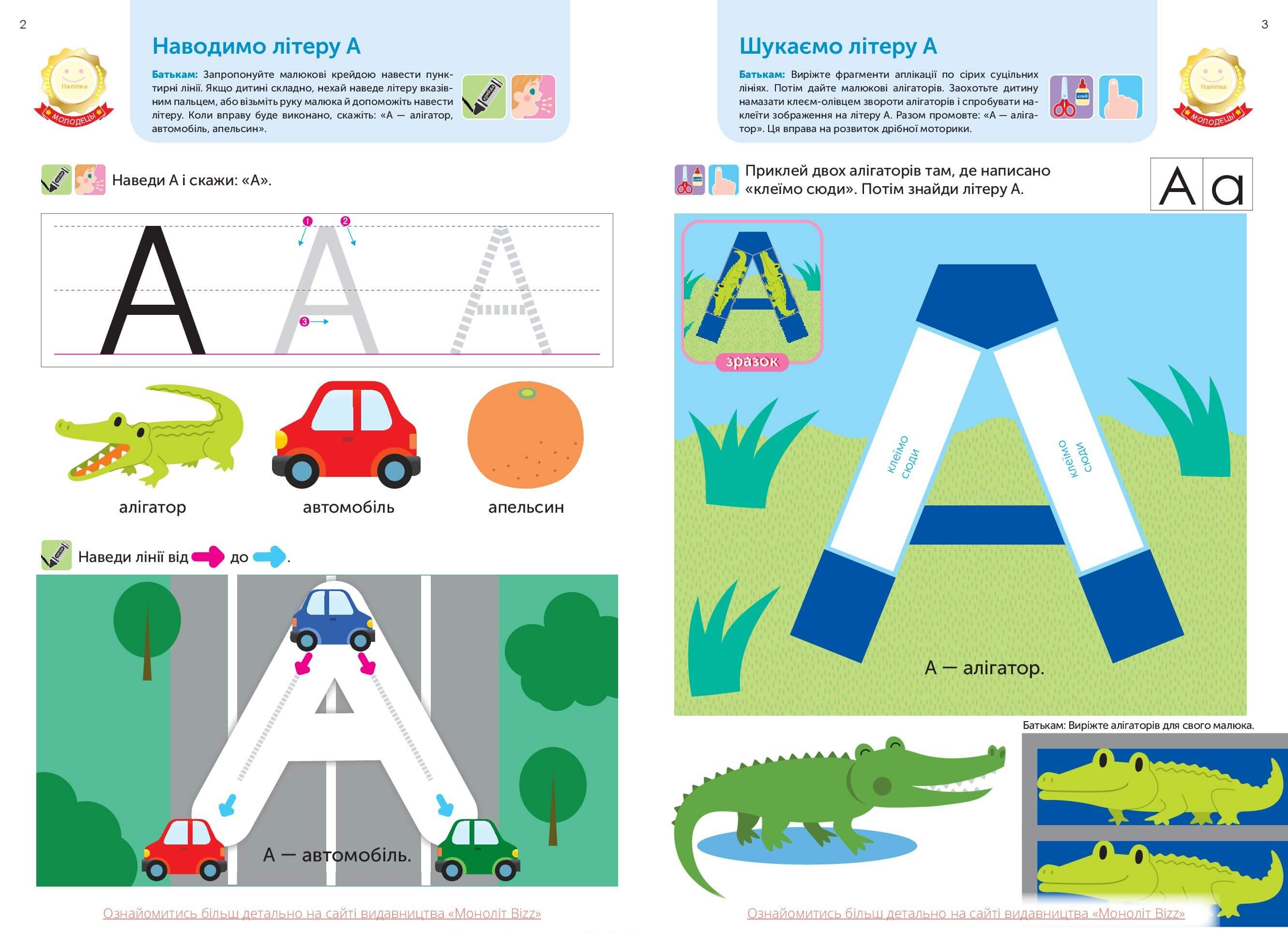 Абетковий порядок неважливий для вивчення літер, тому сторінки цього зошита не обов’язково проходити у якійсь визначеній послідовності. Якщо маля виявляє інтерес до певної літери або вправи, займайтеся ними, доки стане цікавості. Якщо ні — зробіть перерву чи перегорніть на іншу, цікавішу сторінку.