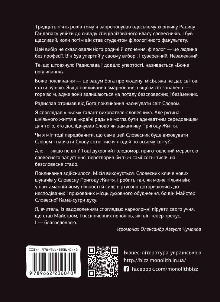 У цій книжці десять глав — десять «заповідей» професійного оратора. У ній автор торкнувся всіх аспектів публічного виступу, починаючи з того, як побороти страх, як правильно стояти спікеру, і закінчуючи тим, як відповідати на підступні запитання. Книжка стане у пригоді кожному: і топ-менеджеру, і продавцеві, і ведучому корпоративів, і тому, хто просто любить виголошувати тости на сімейних святах.