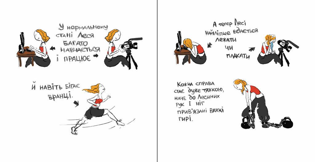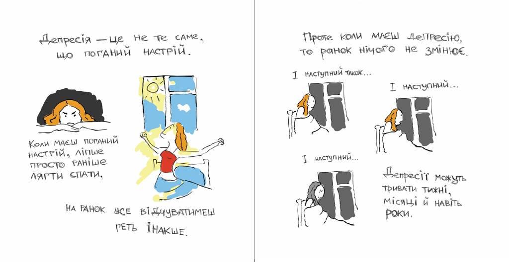 Депресія — це не вигадка, не відмовка й не вияв лінощів. Це справжня серйозна проблема, яку варто й потрібно розв’язувати. То що ж робити, коли світ навколо стає темно-сірим і звичні приємності вже давно не радують? Чи можна якось цьому зарадити? Шукайте відповіді й натхнення в чудовій арт-книжці Саші Скочиленко! ПРО КНИГУ У цій яскравій арт-книжці кожну фразу супроводжує емоційний малюнок, що робить читання проникливим і динамічним. Тут немає довгих нудних оповідей і повчань. Автор просто й душевно подає інформацію, отож вона влучає точно в ціль, надихає, сповнює сил і спонукає до дій. Книжка стане у пригоді всім, хто хоч раз у житті стикався з депресією, і кожному, хто має друга чи родича, який опинився у скруті й потребує допомоги. А також тим, хто хоче заздалегідь «узнати ворога в обличчя», щоб убезпечитися від депресії назавжди. ПРО АВТОРА Саша Скочиленко - незалежна художниця, психоактивістка, журналістка і відеомейкер. Автор мережевих психологічних коміксів, в тому числі вірусної публікації «Книжка про депресію». Здобула освіту режисера та ступінь бакалавра Вільних мистецтв і наук (область концентрації: соціологія і антропологія). Живе з діагнозом: біполярний афективний розлад, пройшла через 7 років особистої психотерапії в якості клієнта. ЦИТАТИ З КНИГИ Подолайте разом! Якщо прагнете допомогти, то ліпше Підбадьорте. Поставтеся з розумінням. Похваліть. А ще ви можете, наприклад Запропонувати просту побутову допомогу, запросити в кіно на легкий веселий фільм, повезти на прогулянку до того місця, яке любить ваш друг. Але інколи людина справді хоче побути на самоті в такий час. Просто дайте їй відчути, що ви поруч і готові допомогти. Депресія VS кепський настрій Депресія — це не те саме, що поганий настрій. Коли маєш поганий настрій, ліпше просто раніше лягти спати, на ранок усе відчуватимеш геть інакше. Проте коли маєш депресію, то ранок нічого не змінює. І наступний також І наступний Депресії можуть тривати тижні, місяці й навіть роки. Свій біль — відчутніший На світі є стільки людей, яким зараз складніше, ніж тобі: особи з інвалідністю, хворі на рак, діти-сироти Так, що б не сталося, завжди будуть люди, яким складніше й гірше, проте сумнівно, що картини чужої біди допоможуть почуватися легше. Усі причини вагомі! Депресія в різних людей може мати різні причини Хтось утратив рідну людину. Чиїсь причини поховані в далекому минулому. Дехто опинився у скруті. У когось ці причини органічні, не пов’язані із зовнішніми факторами. Жодна з цих причин не є більш чи менш «серйозною» підставою для депресії — їх не можна порівнювати.