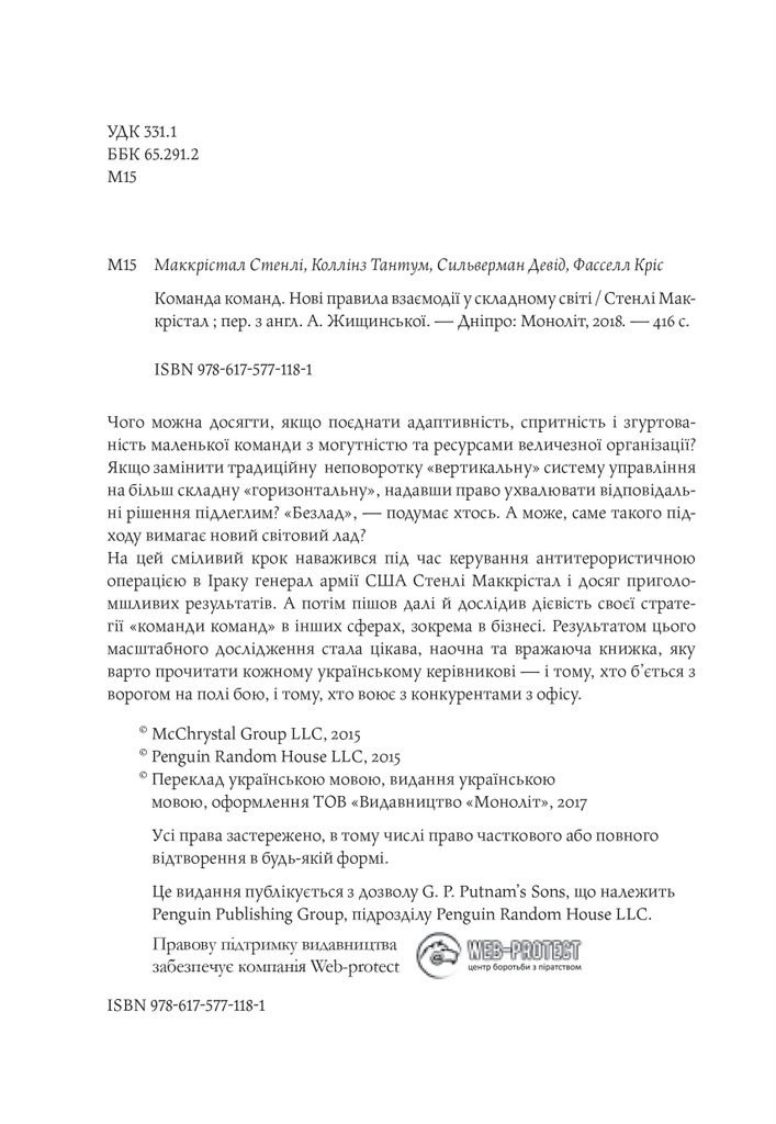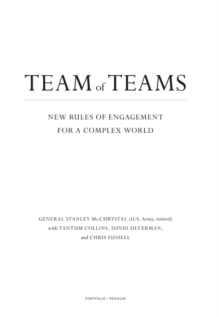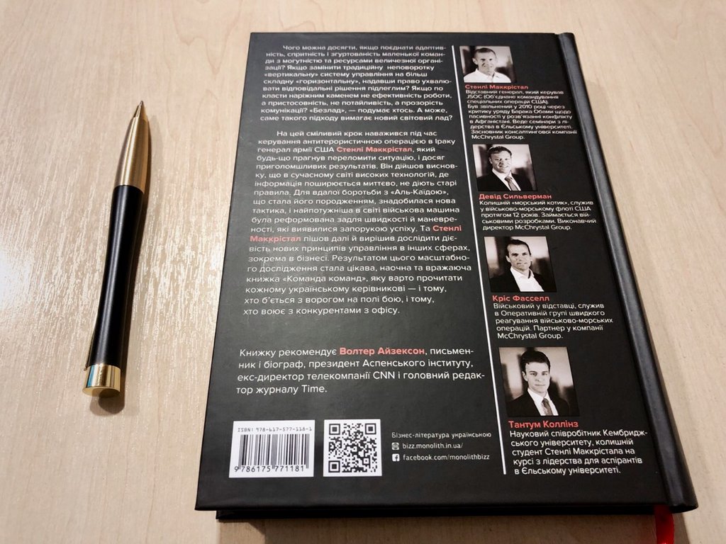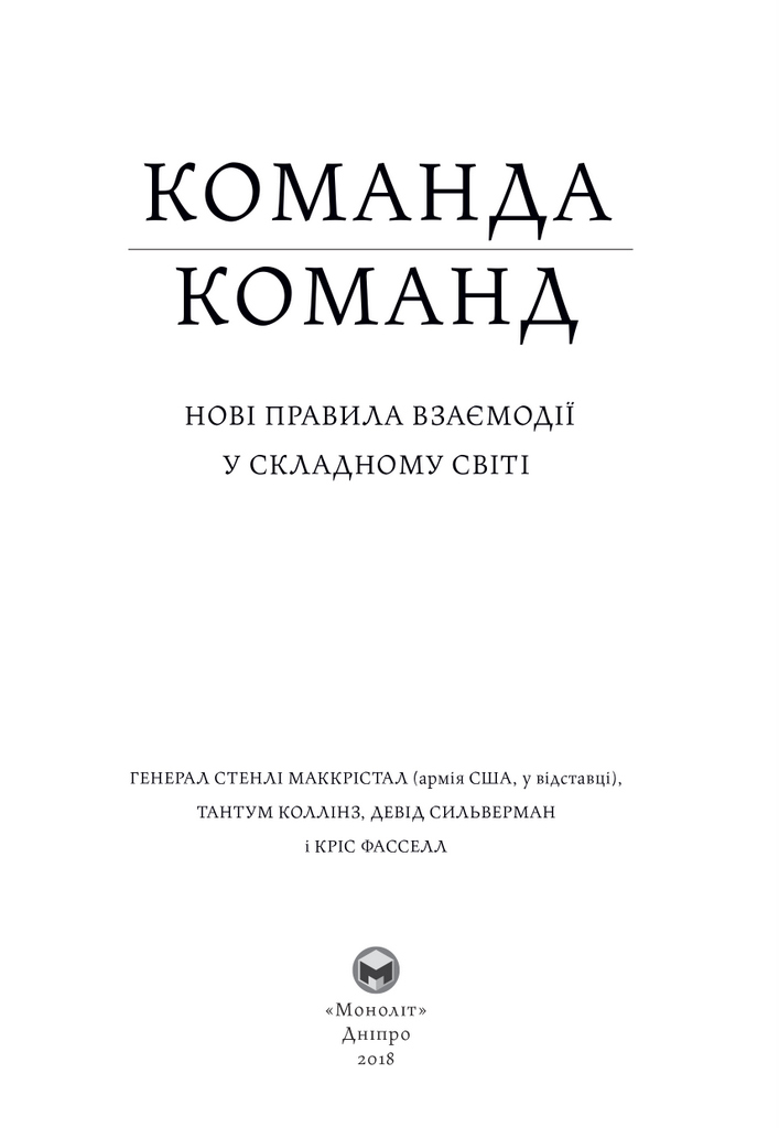 На цей сміливий крок наважився під час керування антитерористичною операцією в Іраку генерал армії США Стенлі Маккрістал і досяг приголомшливих результатів. А потім пішов далі й дослідив дієвість своєї стратегії «команди команд» в інших сферах, зокрема в бізнесі. Результатом цього масштабного дослідження стала цікава, наочна та вражаюча книжка, яку варто прочитати кожному українському керівникові — і тому, хто б’ється з ворогом на полі бою, і тому, хто воює з конкурентами з офісу.