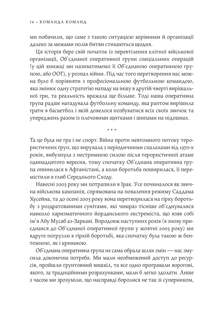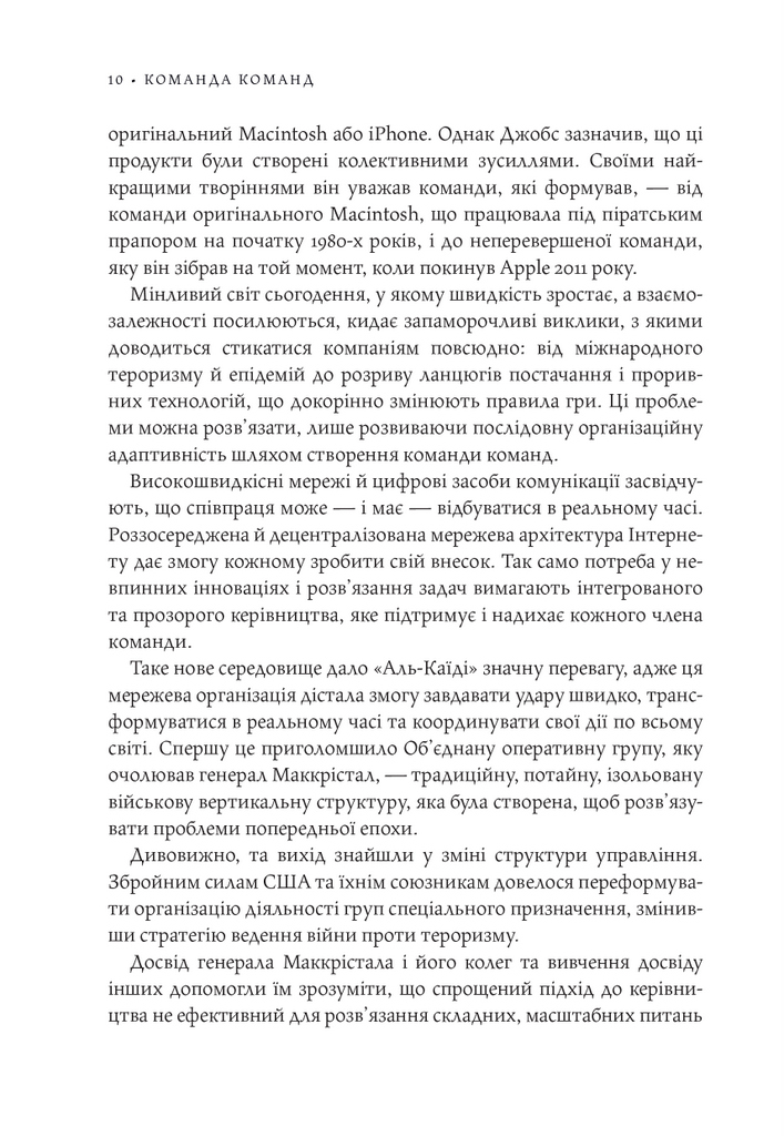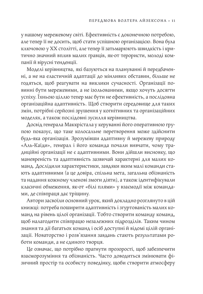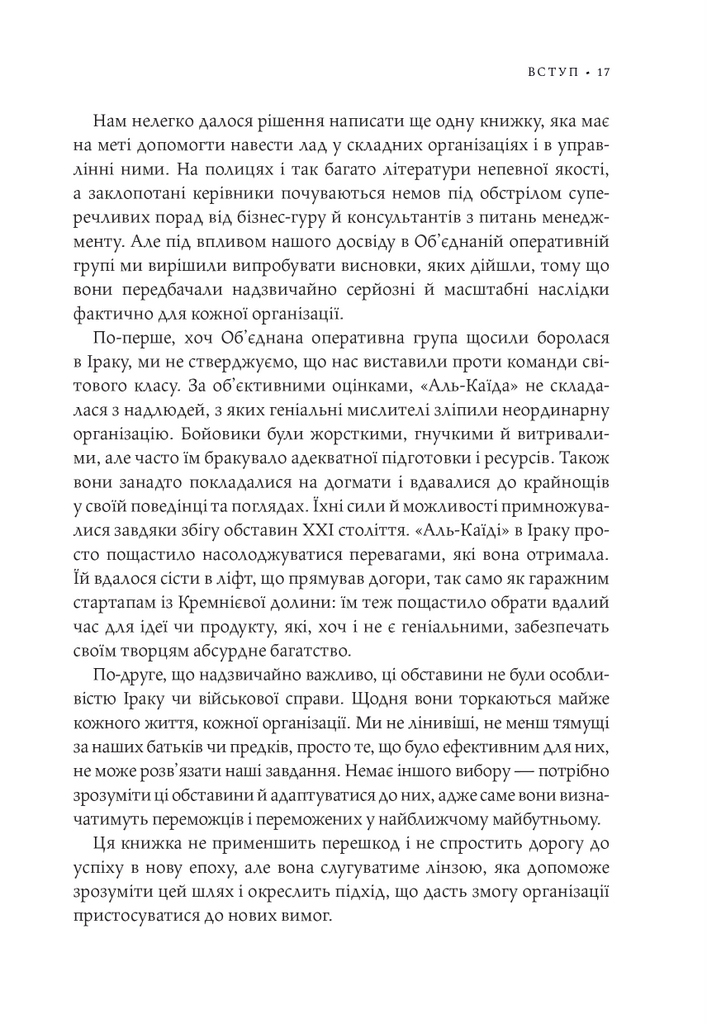 Чого можна досягти, якщо поєднати адаптивність, спритність і згуртованість маленької команди з могутністю та ресурсами величезної організації? Якщо змінити традиційну неповоротку «вертикальну» систему управління на більш складну «горизонтальну», надавши право ухвалювати відповідальні рішення підлеглим? «Безлад», — подумає хтось. А може, саме такого підходу вимагає новий світовий лад?