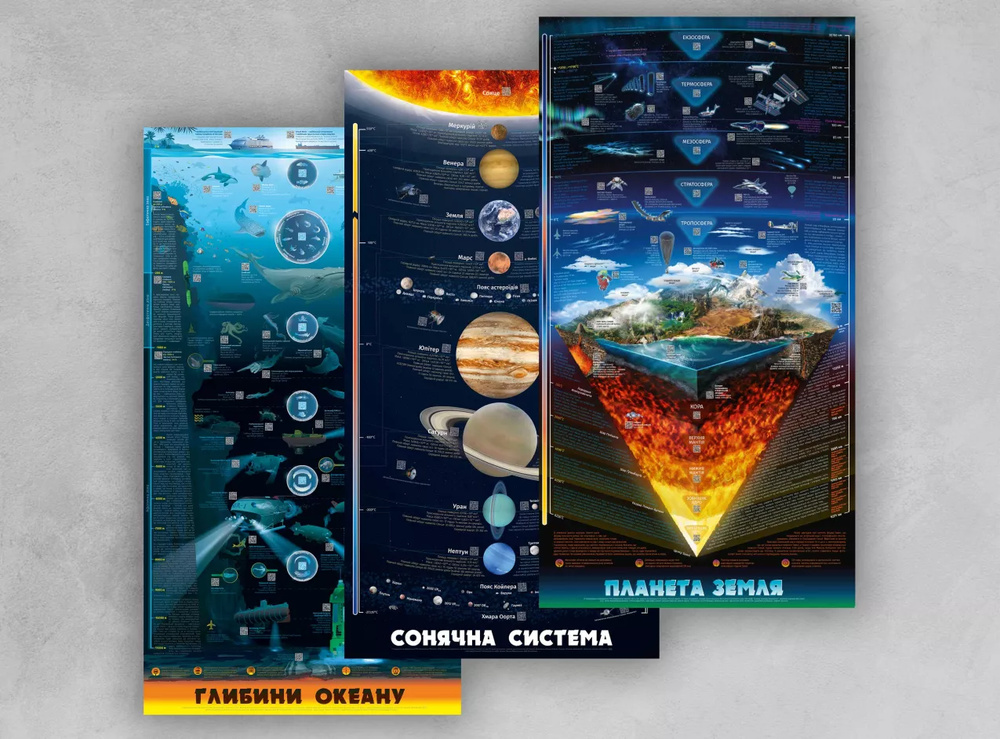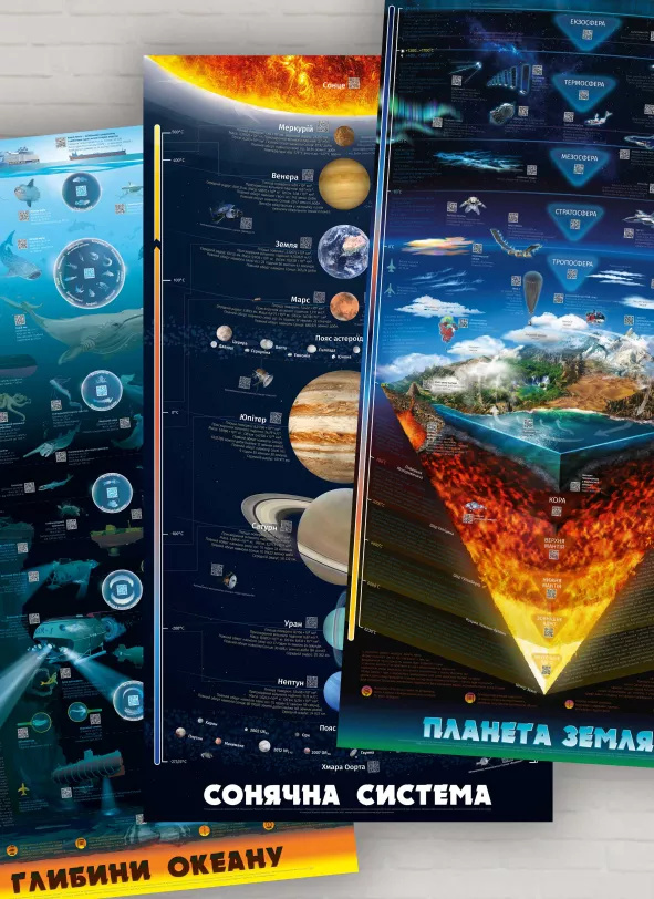 Величезні, яскраві, інформативні та чітко структуровані плакати — це три настінні інтерактивні енциклопедії в одному тубусі!