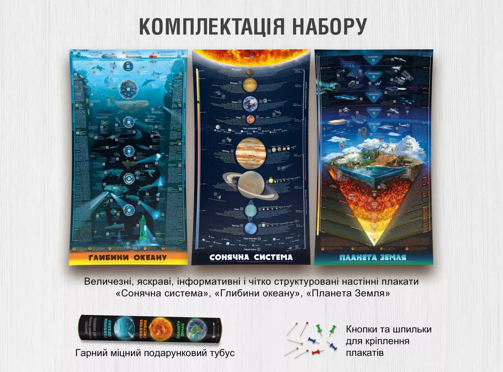 Унікальний комплект «Світ навколо», що складається з трьох розумних плакатів,— стане справжнім відкриттям для вашої дитини. Захопливий політ до зірок і планет, дослідження океанічного дна, занурення до самісінького центру Землі — пригоди, які не просто заворожують і ваблять, а й розширюють кругозір.