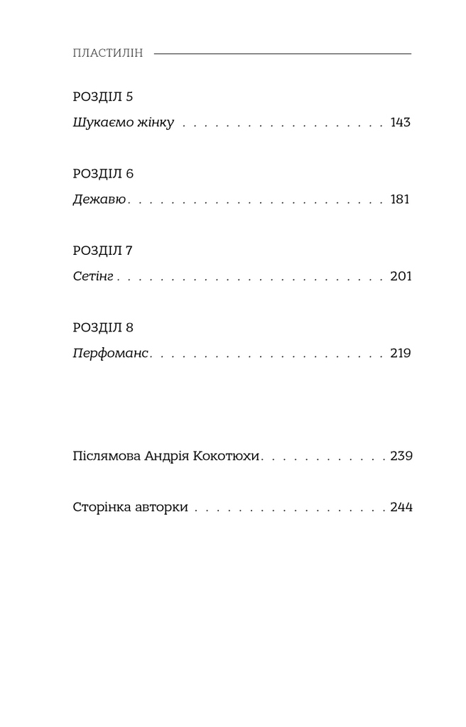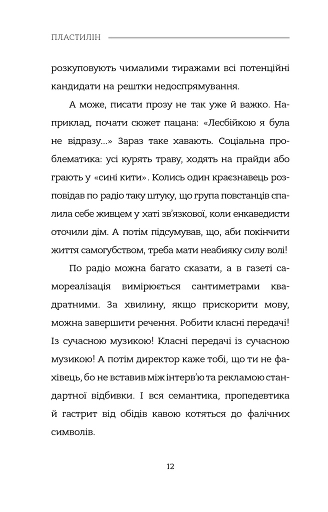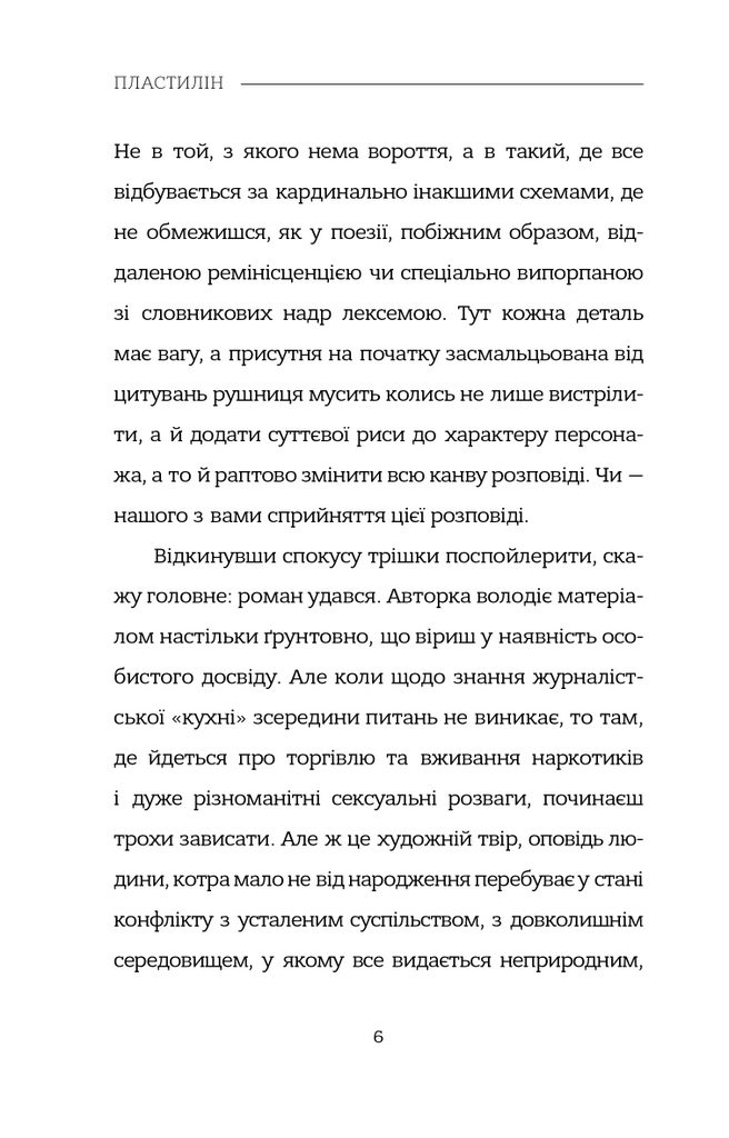 «Пластилін» — це кардинально нове слово в сучасній українській літературі. Головний герой роману — журналіст на прізвисько Кекс — береться за розслідування вбивства одинадцятьох своїх колег, заразом поринаючи в глибини власної душі й ув’язаючи в пластиліновій масі людської буденності.
