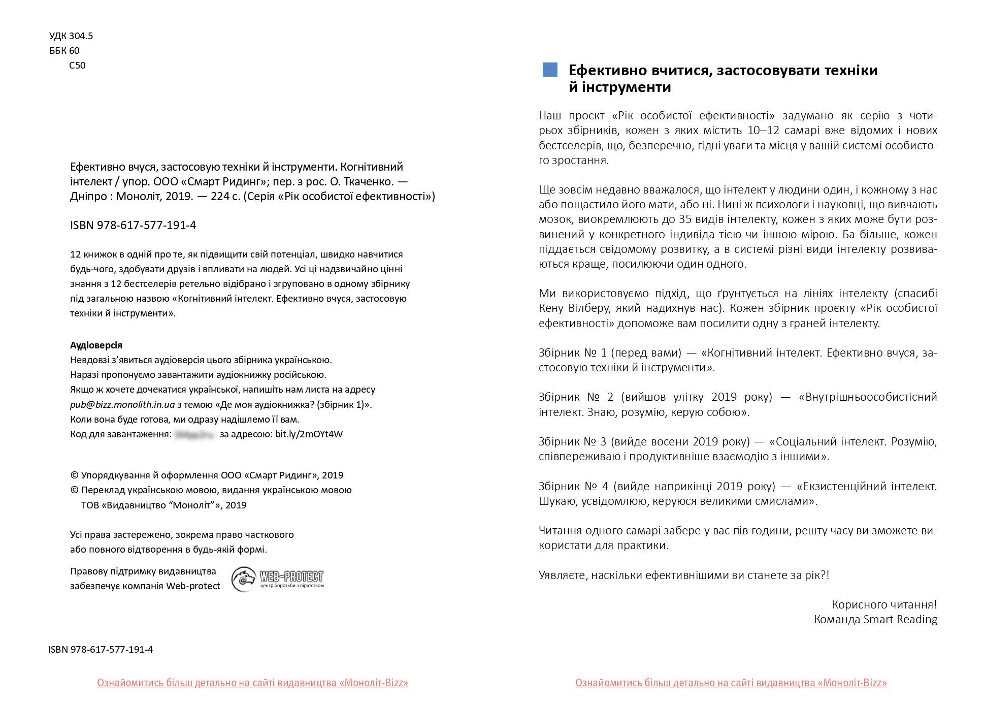 12 книжок в одній про те, як розвинути здатність ефективно навчатися, використовуючи для свого розвитку максимум доступних технік та інструментів. Усі ці надзвичайно цінні знання з 12 бестселерів команда Smartreading ретельно відібрала і згрупувала в одному збірнику під загальною назвою: «Когнітивний інтелект. Ефективно вчуся, застосовую техніки й інструменти»
