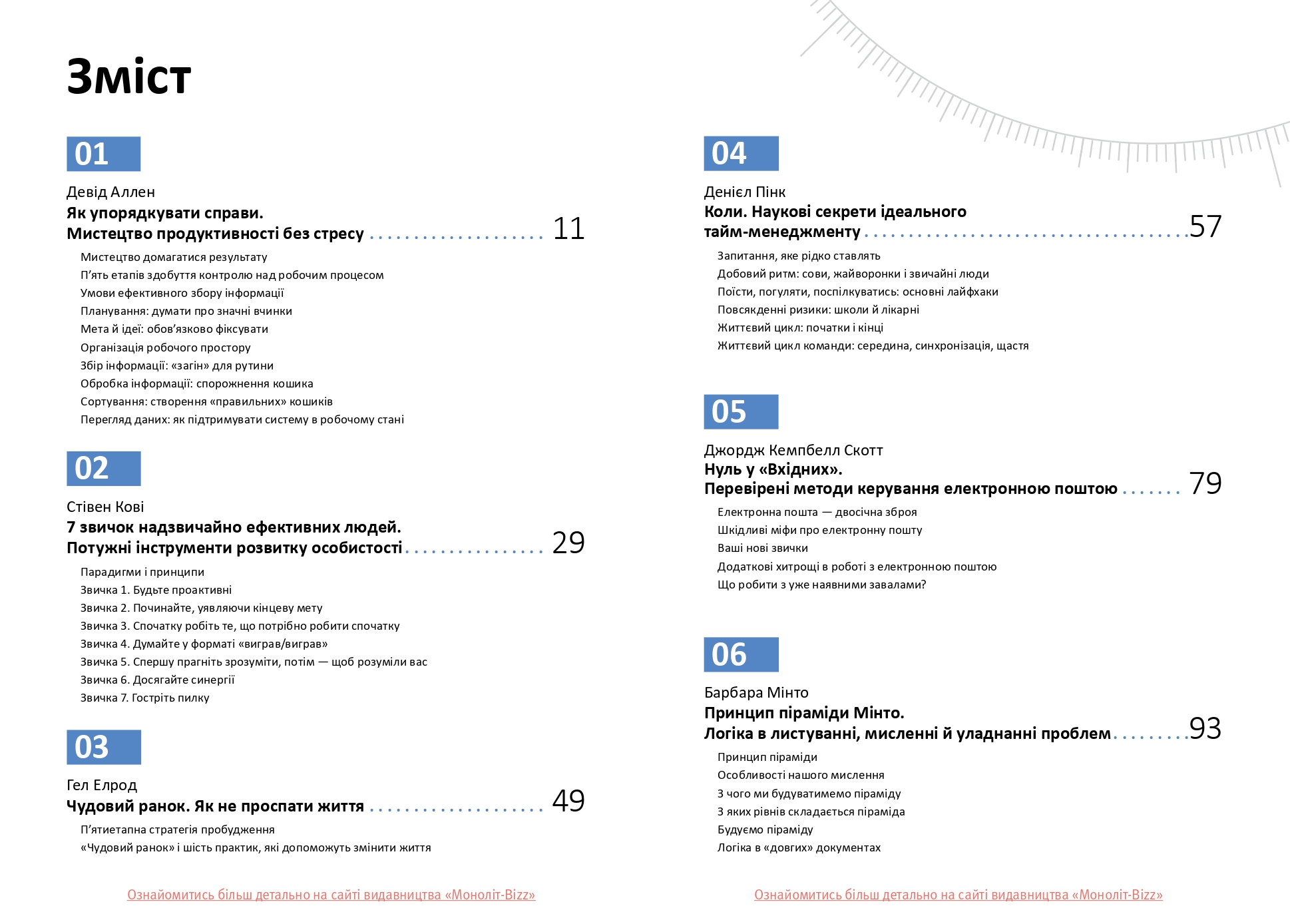 Серія «Рік особистої ефективності» — це 4 збірники, кожен з яких містить 12 самарі найцінніших книжок з особистого розвитку й особистої ефективності. Всі ці книжки – безумовний мастрід, гідний посісти важливе місце в системі знань людини, що налаштована на зростання і бере на себе відповідальність за своє щастя й успіх.