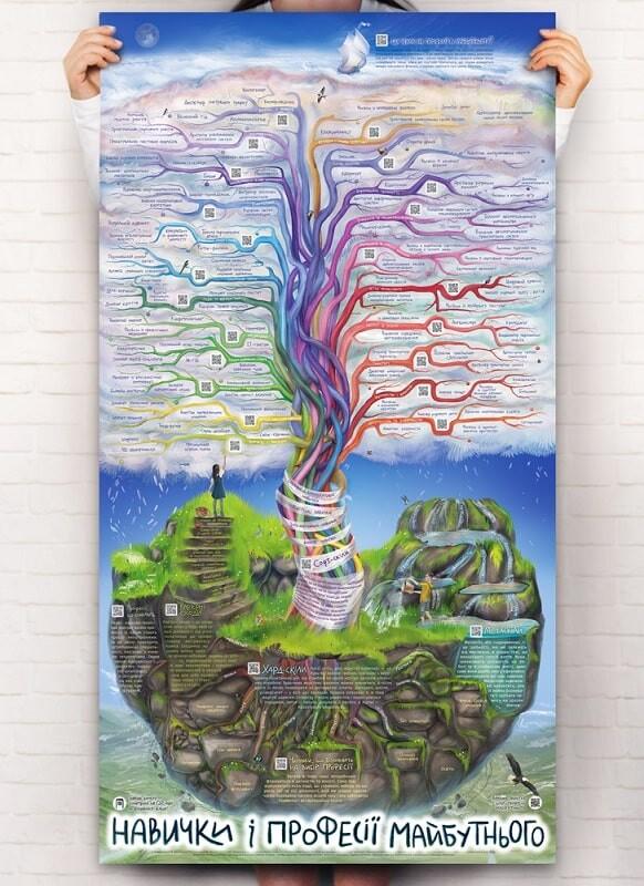 Інформація на плакаті представлена високим деревом з розлогою кроною та потужним сплетінням коренів. Це не випадково! Посилено розвиваючи кореневу систему (хард-скіли), рясно підживлюючи дерево живильним поливом (метаскілами), зміцнюючи стовбур (софт-скіли), можна вирости у справжнього профі і фахівця своєї справи.
