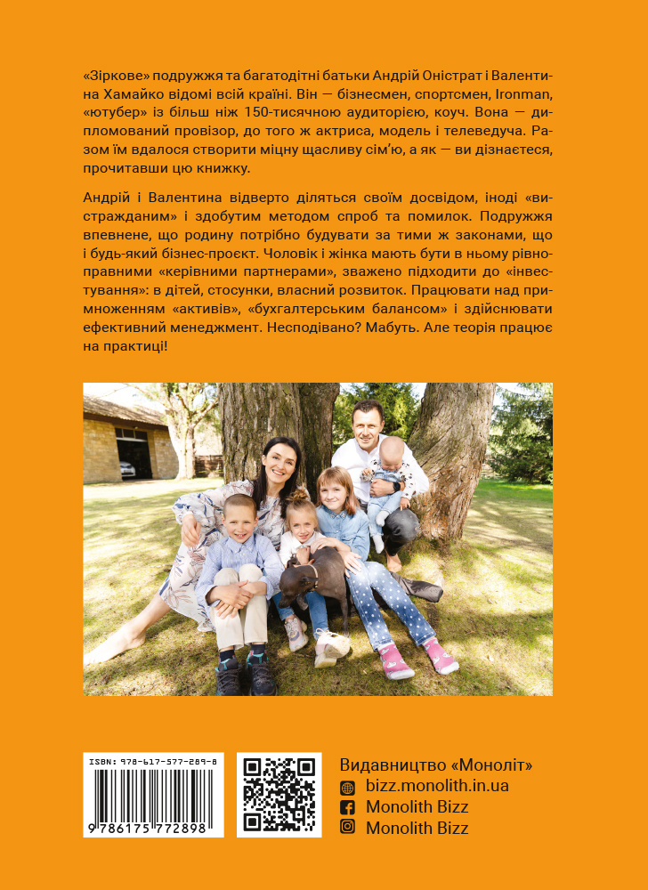 Хочете відкрити найважливіші секрети створення щасливої родини? А розібратися в тому, як виростити здорових, відповідальних, усебічно розвинених і адаптованих до життя в соціумі дітей? Тоді книга Андрія Оністрата, відомого спортсмена і бізнесмена, автора мотиваційних книг і роликів, і його дружини Валентини Хамайко, популярної телеведучої та дивовижної матері чотирьох чудових дітей, — саме те, що вам потрібно.