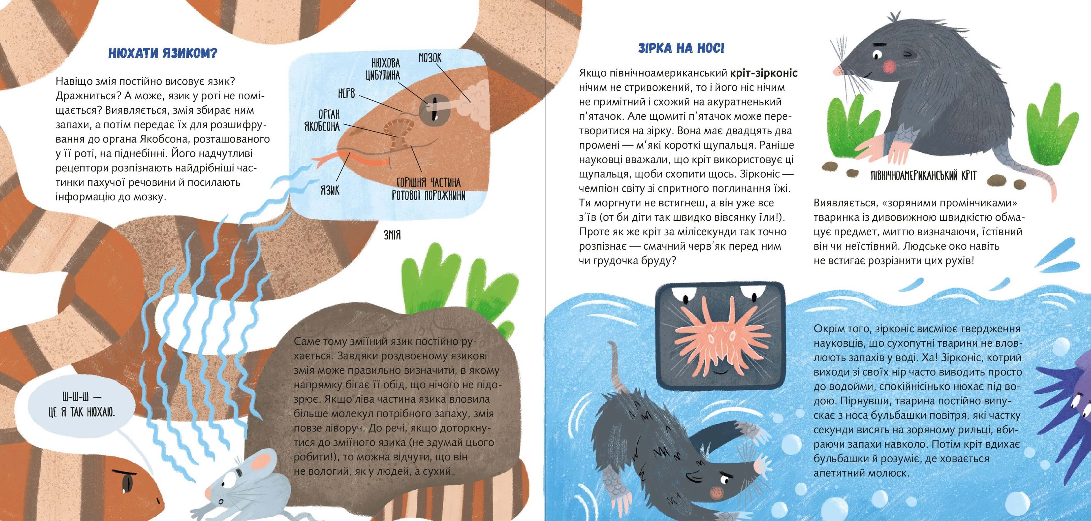 З’ясуймо разом, хто з них найпрудкіший чи найхитріший, хто найвправніший мисливець, а хто може вмить стати невидимкою. А ще — чи є летючі жаби, чи справді білі ведмеді мають перетинки, а змії нюхають язиком… Кортить дізнатися? Тоді хутчіше вирушай у подорож із нашим путівником у захопливий світ природи!