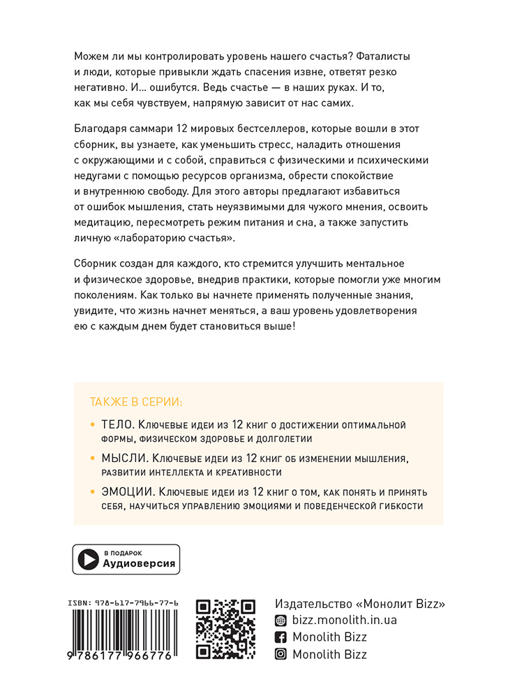 Чи можемо ми контролювати рівень нашого щастя? Фаталісти і люди, які звикли чекати на порятунок ззовні, рішуче скажуть «ні». І... помиляться. Адже щастя у наших руках. За допомогою саммарі 12 світових бестселерів, які увійшли до цієї збірки, ви дізнаєтеся, як розвинути внутрішній спокій, знизити рівень стресу, налагодити взаємини з оточуючими та з собою, зможете зміцнити фізичне та ментальне здоров'я, а також досягти відчуття свободи.