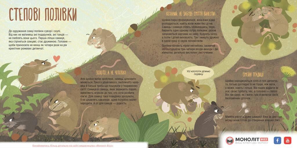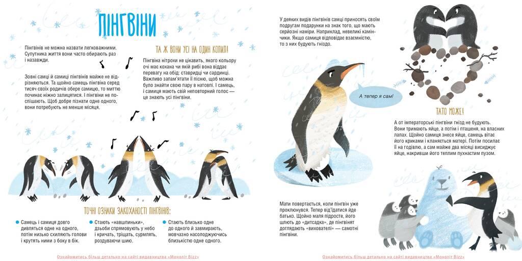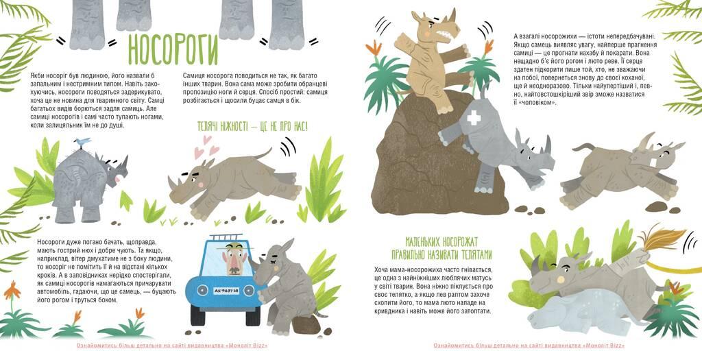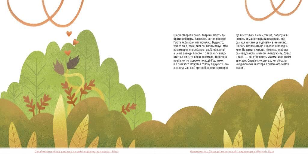 Тварини часто для нас незбагненні і привабливі, особливо коли ми бачимо те, що неможливо пояснити лише інстинктами і природою. Як же звірі, птахи, комахи й навіть риби знаходять собі пару? У цій книжці на вас чекають дивовижні історії про те, як тварини закохуються, створюють сім’ї і ростять своїх малят. Завдяки яскравим малюнкам та оригінальному викладу фактів книжка приверне увагу і малих, і дорослих читачів й уже не відпустить до останньої сторінки. Ви здивуєтеся, дізнавшись, як багато між нами спільного!