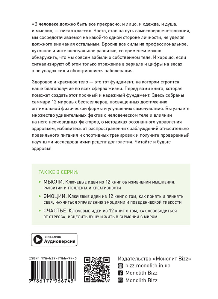 Здорове та гарне тіло – це той фундамент, на якому будується наше благополуччя у всіх сферах життя. Перед вами книга, яка допоможе створити цей міцний та надійний фундамент. Тут зібрані саммарі 12 світових бестселерів, присвячених досягненню оптимальної фізичної форми та покращенню самопочуття. Ви дізнаєтеся безліч цікавих фактів про будову власного тіла і зрозумієте, як примножувати, а не руйнувати подарований природою потенціал, і зможете раз і назавжди змінити свій спосіб життя.