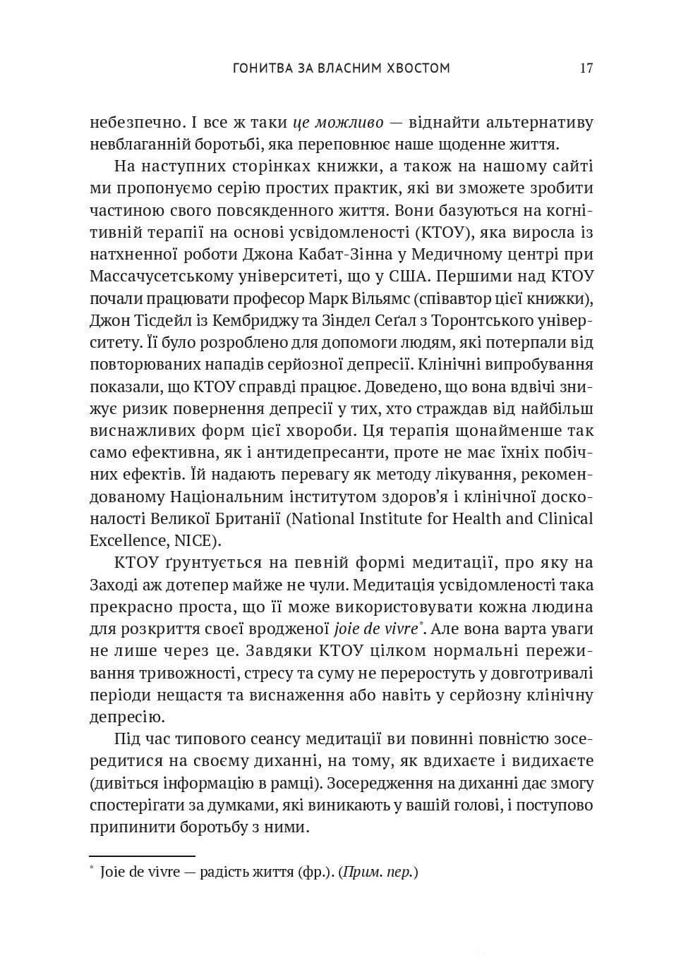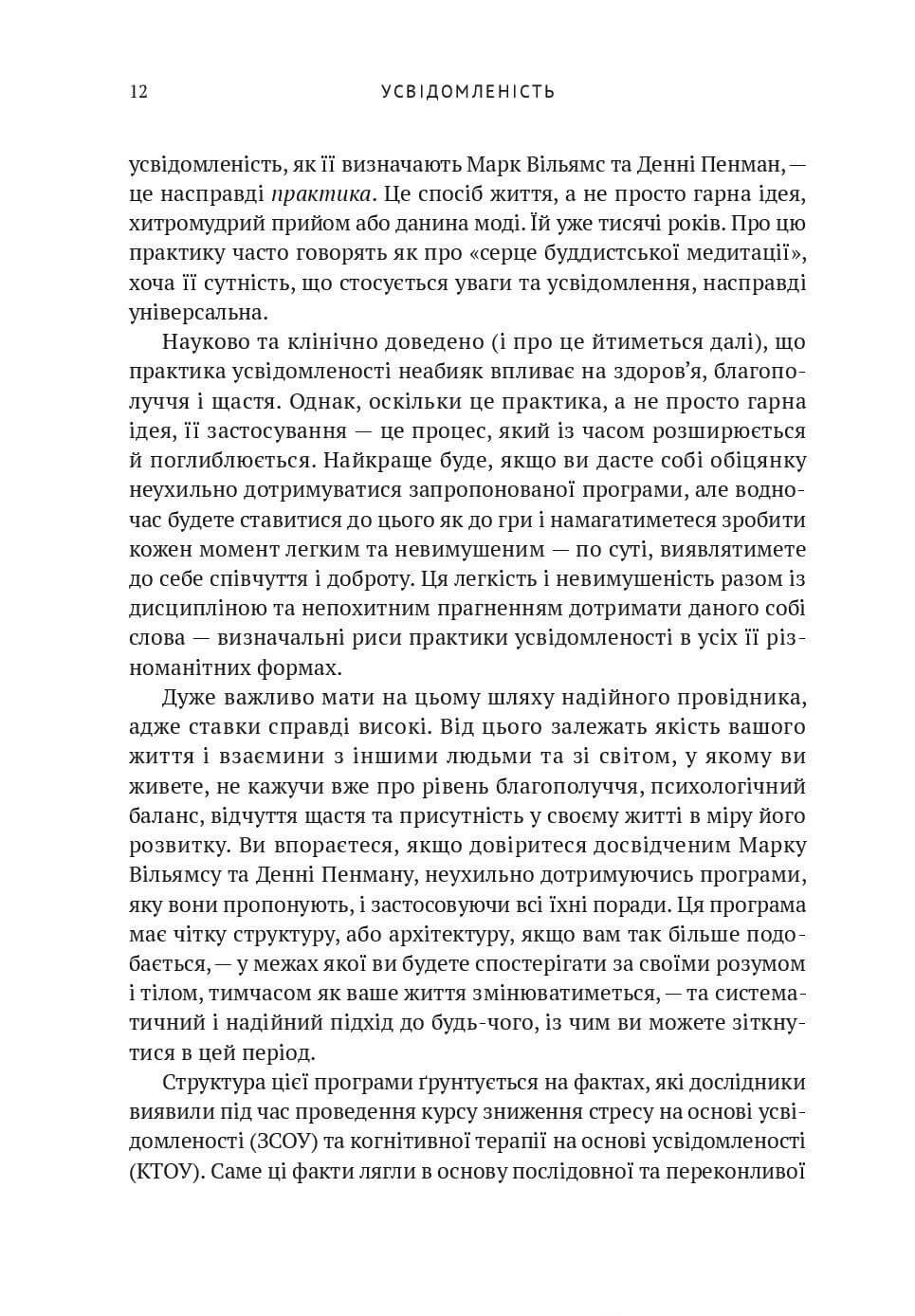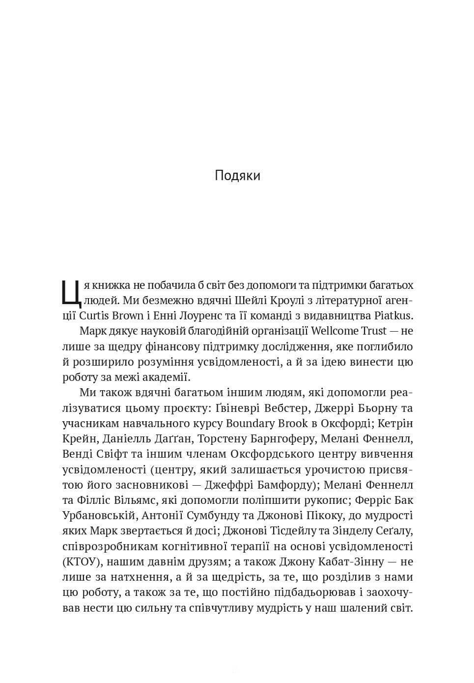 Практика усвідомленості на Заході давно рятує мільйони людей від хронічного стресу і депресії, чи не найпоширеніших недуг сучасного світу. Сьогодні і в Україні вона стрімко стає популярною. Одним із фундаторів «терапії усвідомленості» є професор Марк Вільямс. Разом із доктором Денні Пенманом вони створили цю книжку.