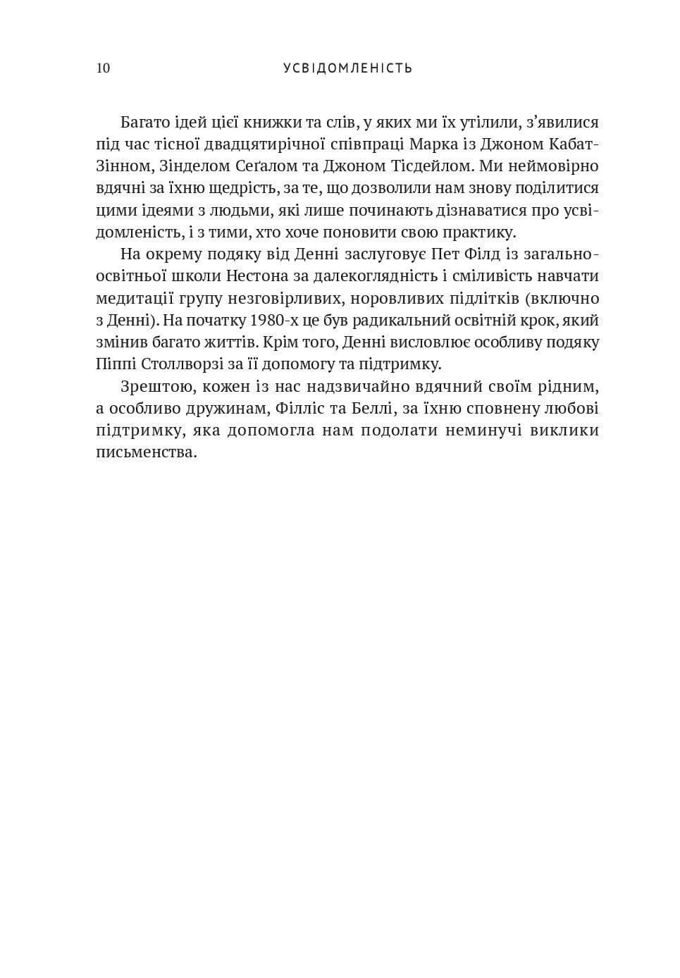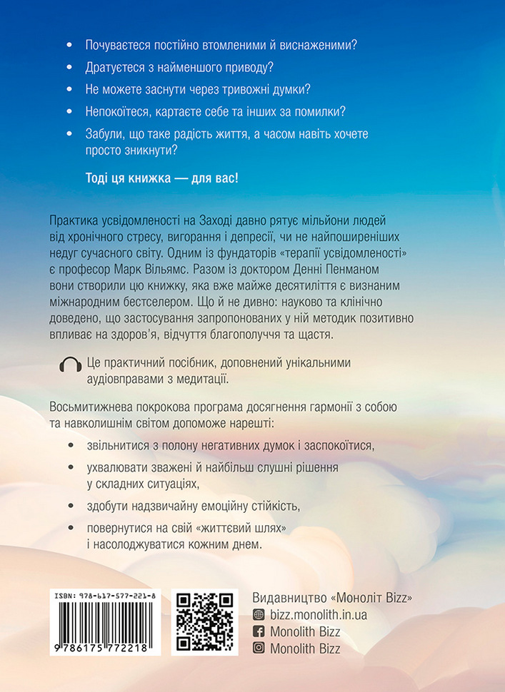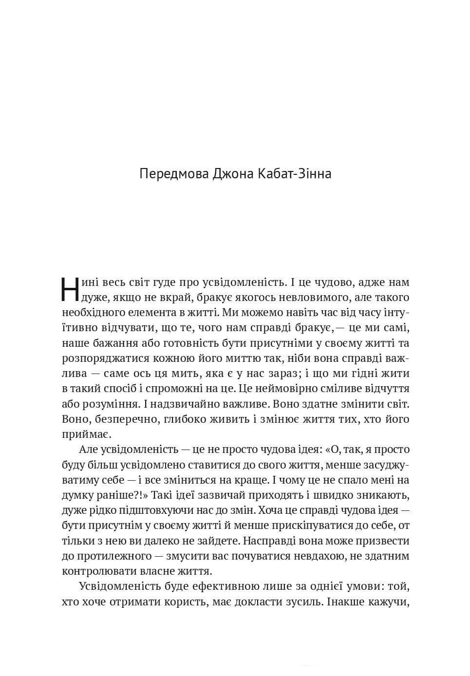 Практика усвідомленості на Заході давно рятує мільйони людей від хронічного стресу і депресії, чи не найпоширеніших недуг сучасного світу. Сьогодні і в Україні вона стрімко стає популярною. Одним із фундаторів «терапії усвідомленості» є професор Марк Вільямс. Разом із доктором Денні Пенманом вони створили цю книжку.