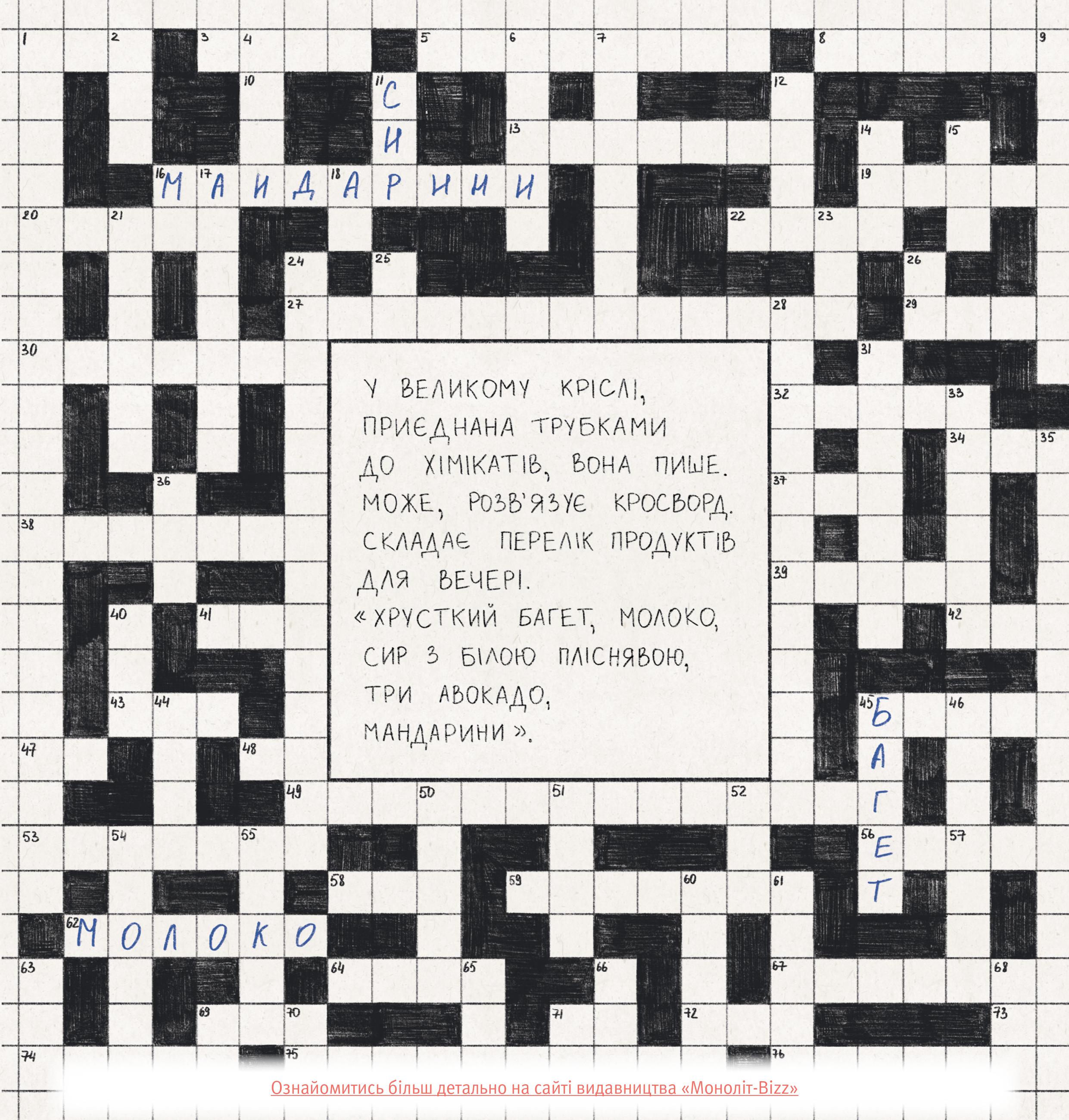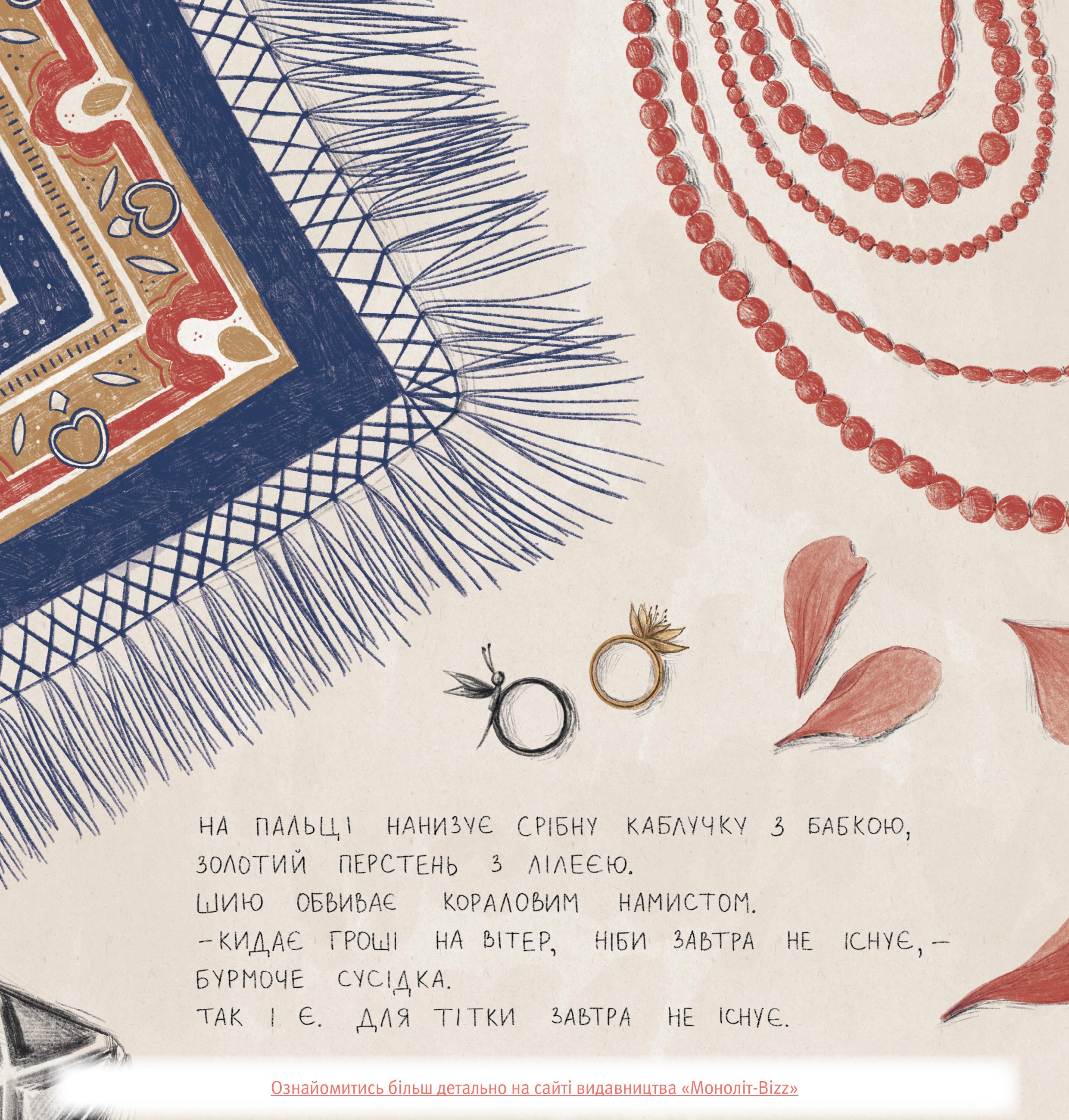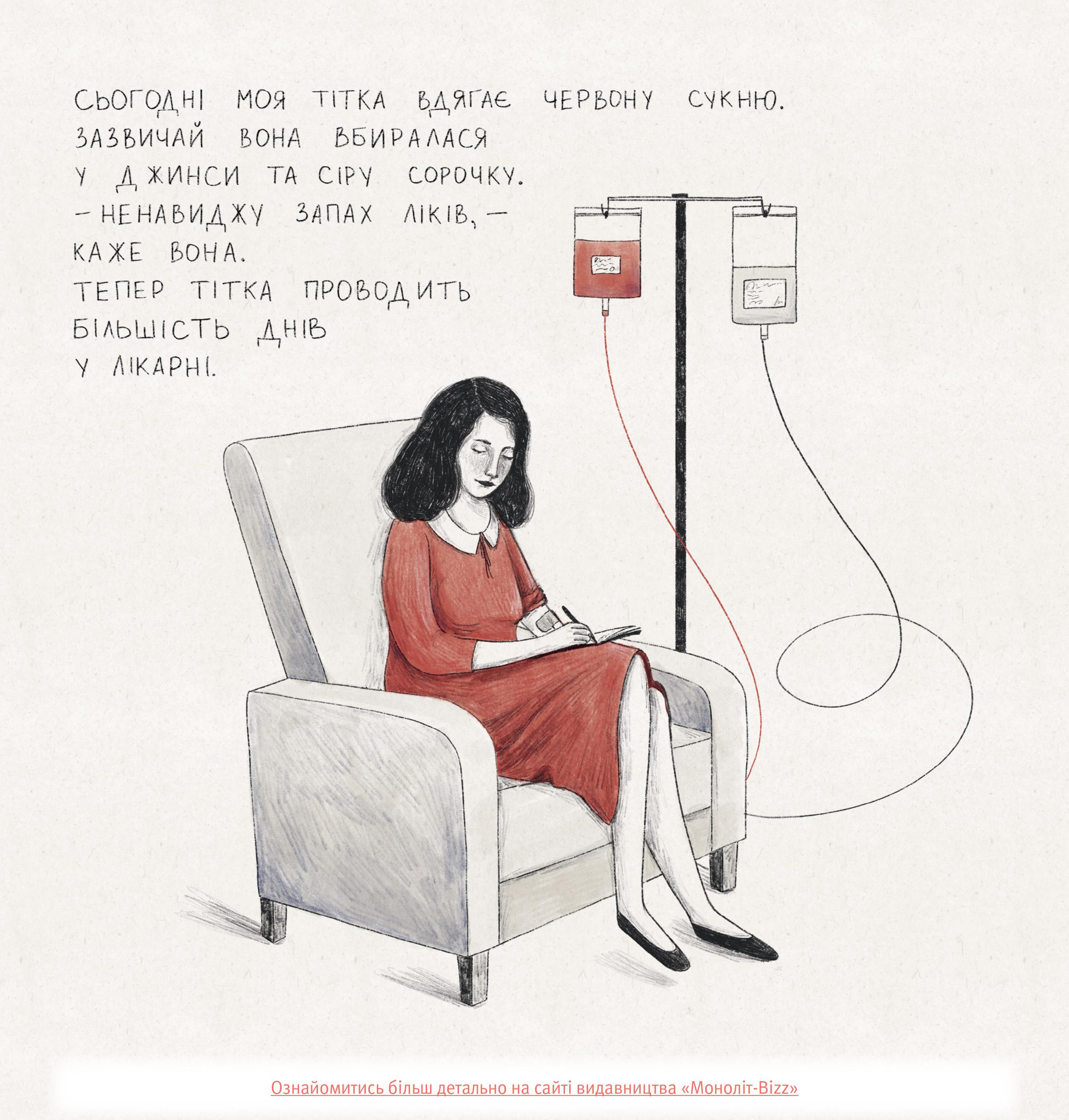 «Вона вірить у любов до своєї справи, бесідує про поезії Ліни Костенко зі студентами, їздить на ровері парком, густим від дитячого сміху, плаває серед фіолетово-жовтих смугастих риб, виполює бур’ян, що дратує пудрові троянди в саду». А ще вона вдягає червону сукню і поводиться так, ніби завтра не існує. Для неї це справді так. Тому вона насолоджується красою світу і проживає кожну мить відважно і яскраво, у творчості, любові й радості.
