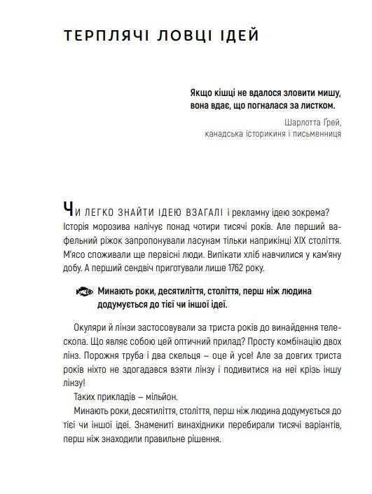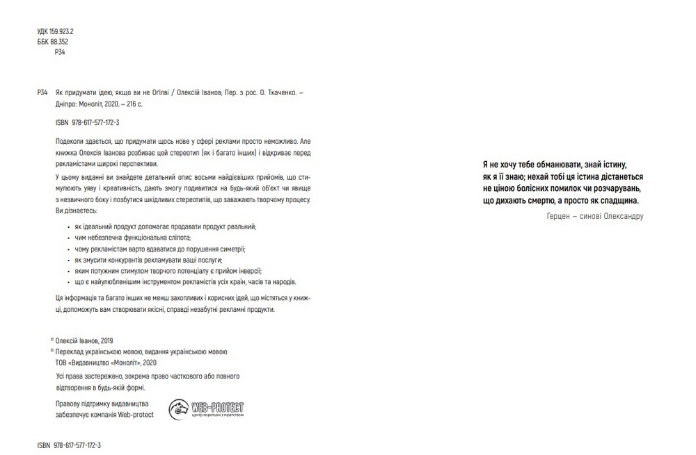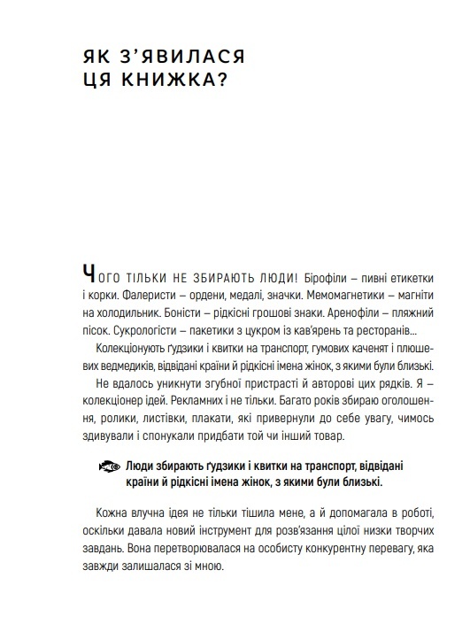 Реклама — рушій прогресу і запорука продажів. Вона оточує нас зусібіч. Часом викликає нестримний захват, нерідко дратує, а іноді залишає цілком байдужими. Подеколи здається, що всі яскраві ідеї уже вичерпано і придумати щось нове у цій сфері просто неможливо. Але книжка Олексія Іванова розбиває цей стереотип (як і багато інших) і відкриває перед рекламістами широкі перспективи.