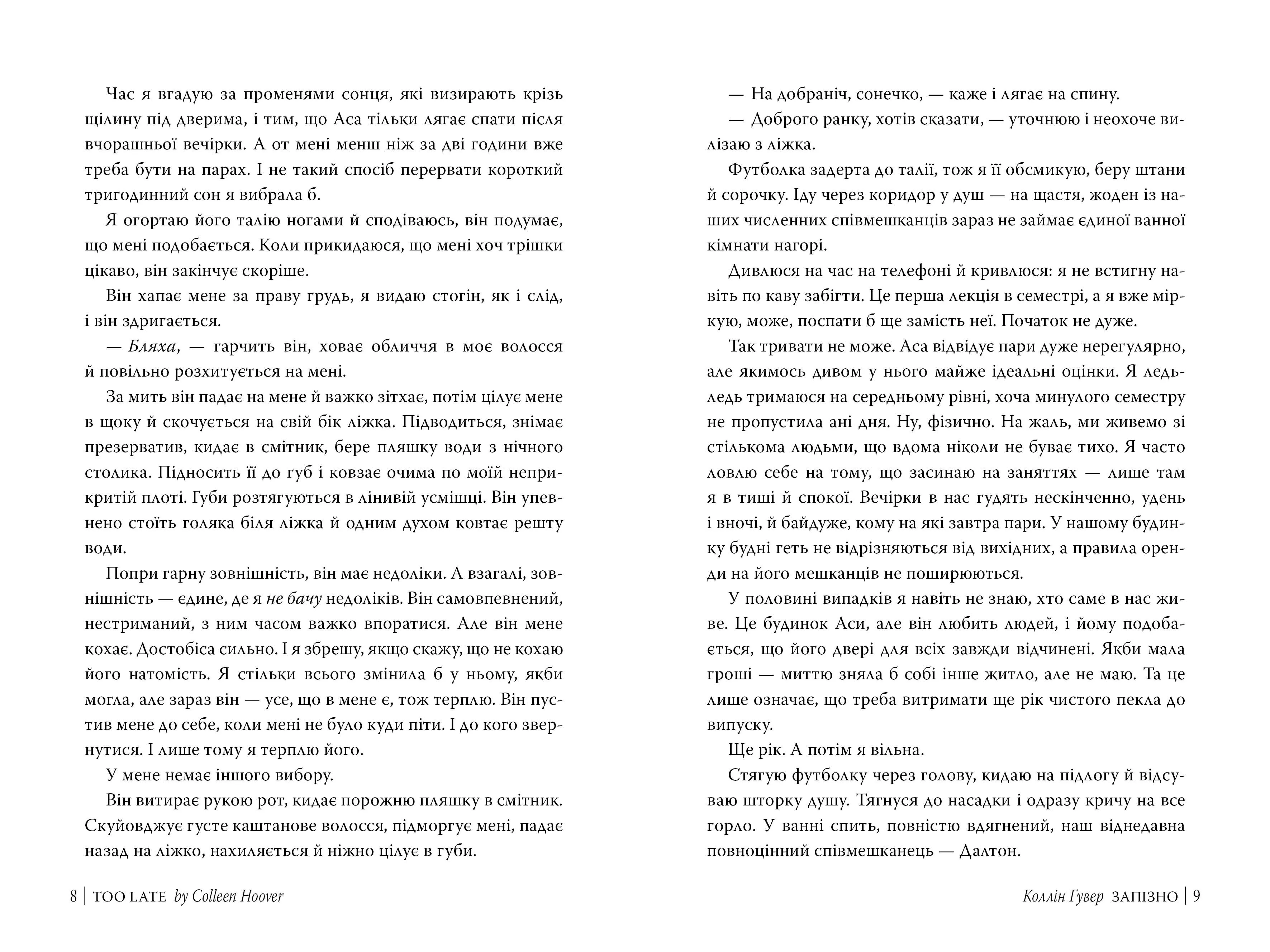 Книга Запізно, яку написала всесвітньо відома авторка Коллін Гувер, поєднує напругу емоційного трилера з драматизмом романтичної історії. У центрі сюжету — молода жінка Слоан, що щодня проходить крізь особисте пекло, заради тих, кого любить.