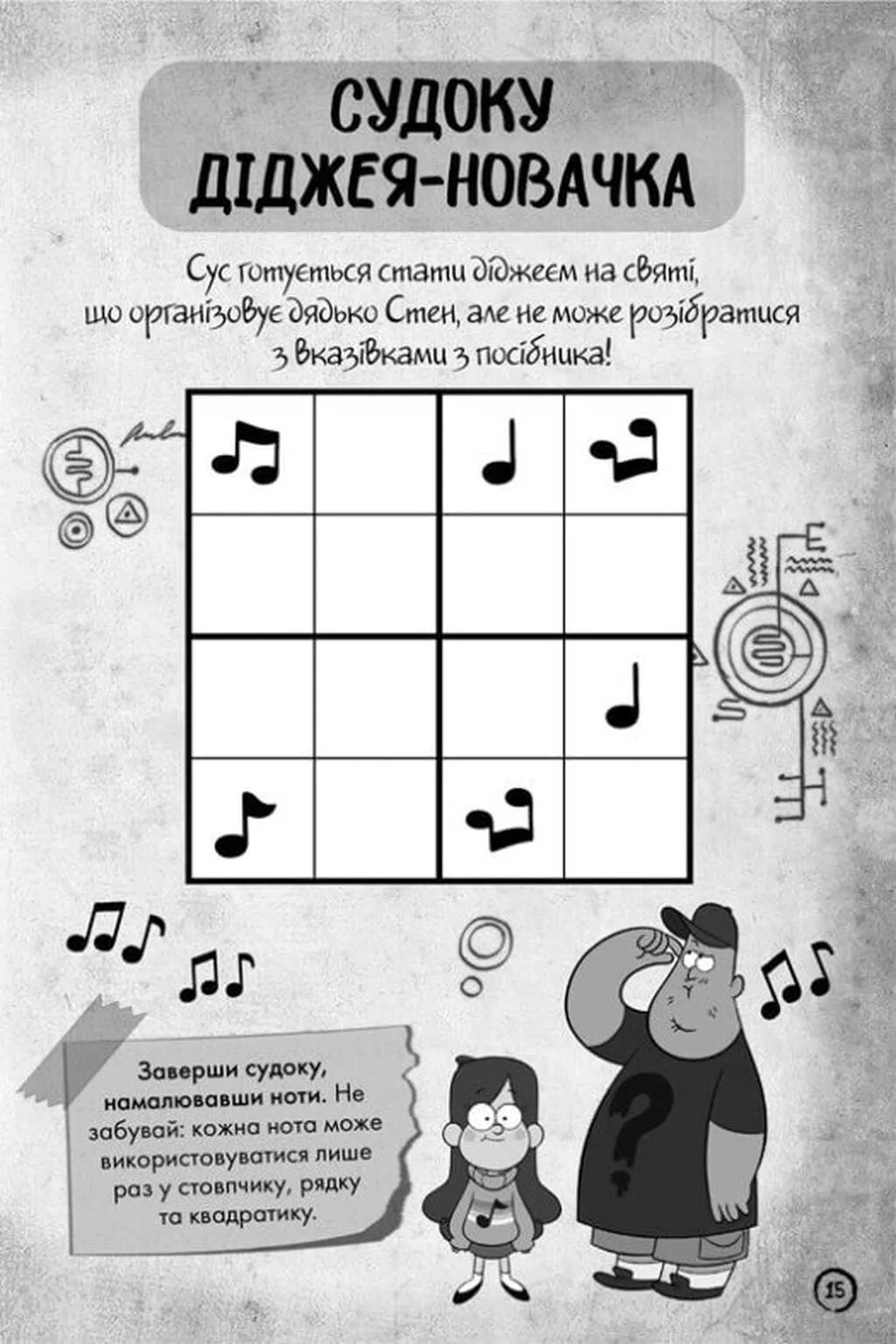 Книга також містить різноманітні загадки та задачі, які зроблять читання ще цікавішим. Читачам доведеться поламати голову над шифрами, знайти приховані підказки та розгадати таємниці міста Ґравіті Фолз.