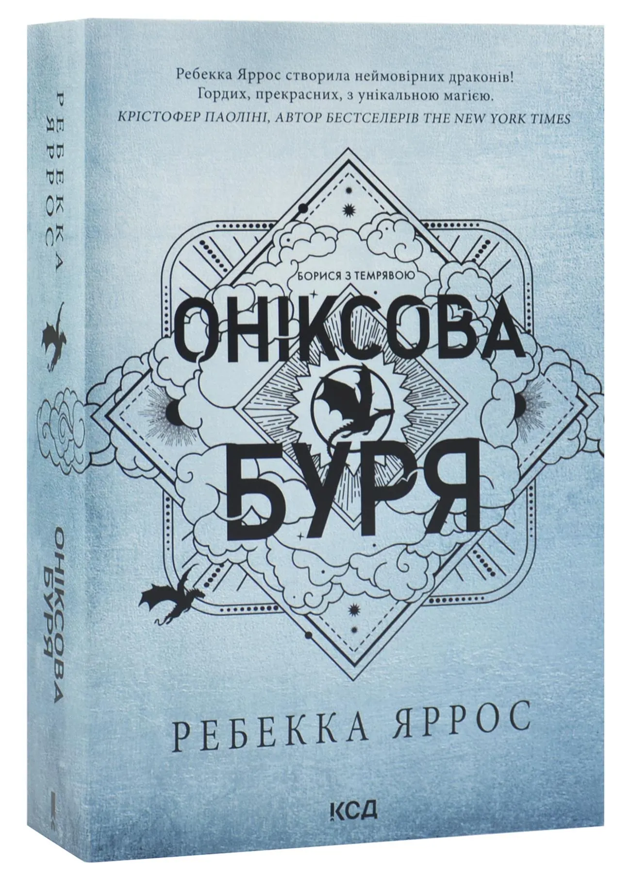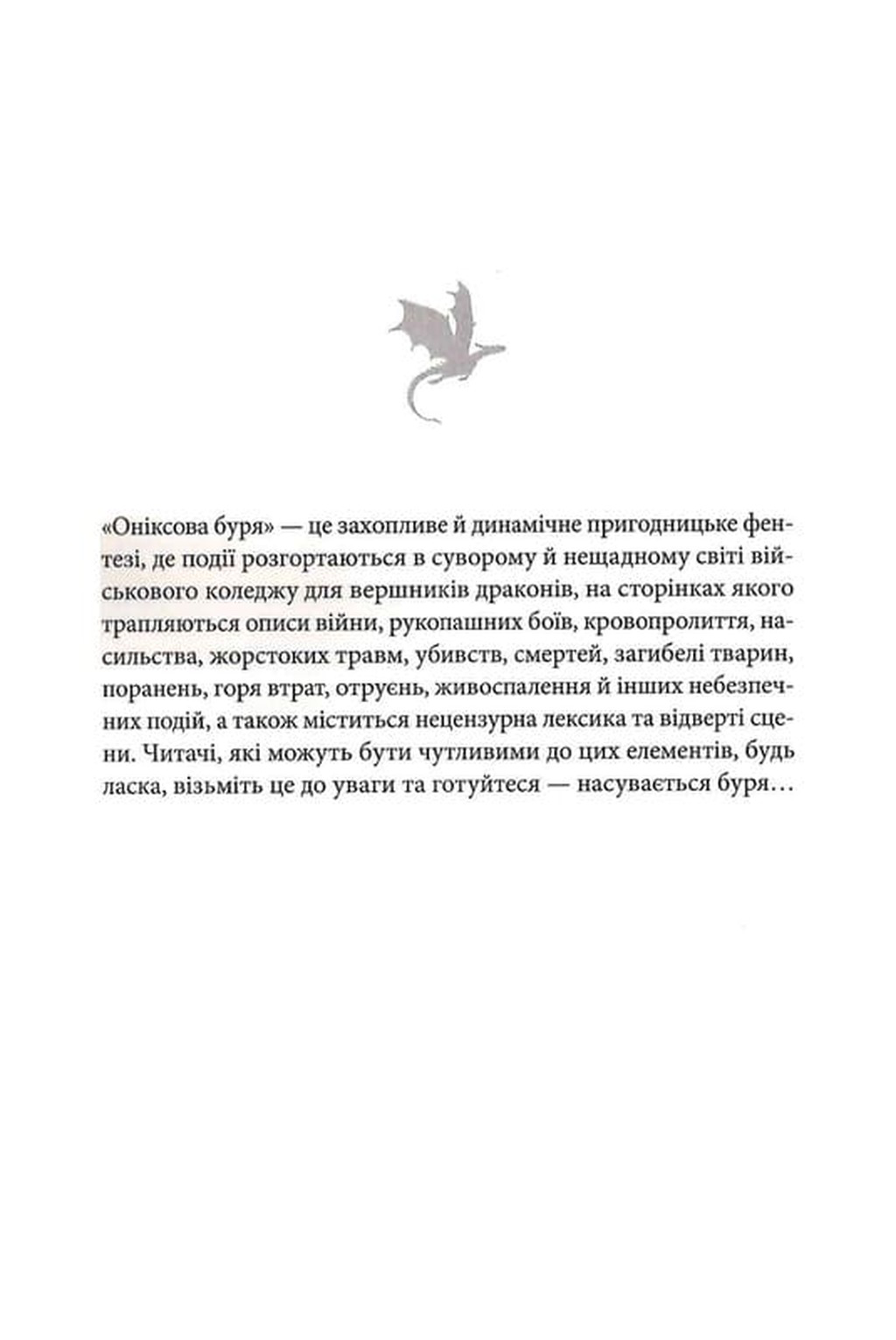 Оніксова буря (м'яка) — це довгоочікуване продовження фентезійної серії від бестселерної авторки Ребекки Яррос. Книга є наступним етапом гучної історії, розпочатої в Четвертому крилі та Залізному полум’ї. Перевидання в оновленому форматі без кольорового зрізу відзначається не лише новою обкладинкою, а й удосконаленою структурою для зручного читання.
