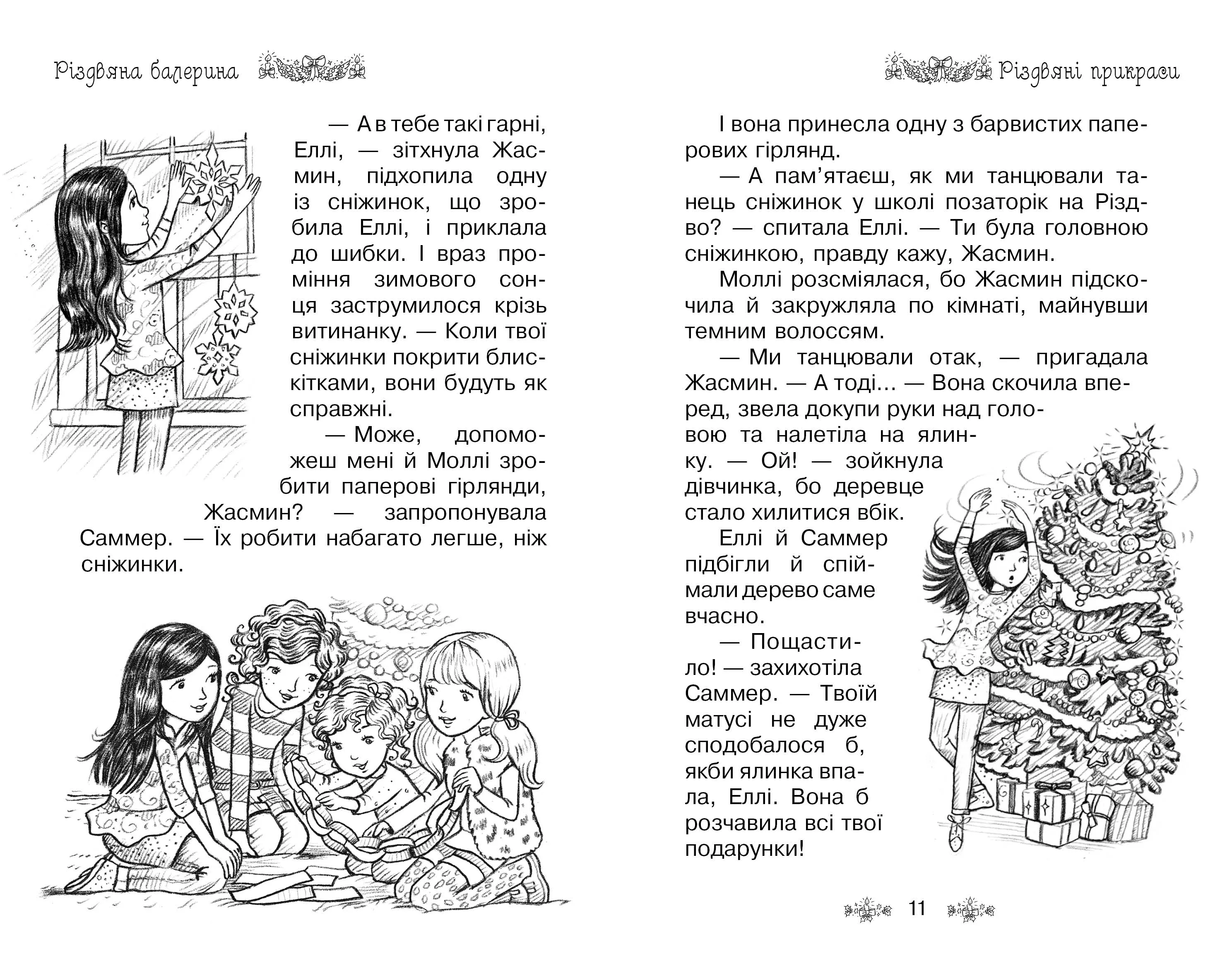 І справді, маленька фея Тріксі прилітає запросити подружок до Різдвяного палацу короля Веселого. Цьогоріч свято там обіцяє бути особливим. Для гостей має танцювати неперевершена балерина Розалінд… Точніше, мала б… Річ у тім, що Розалінд не приїхала до палацу. Вона зникла. Чи зуміють дівчатка зарадити лиху? Чи вдасться їм знайти балерину та врятувати свято? Читай про це в чарівній історії «Різдвяна балерина».