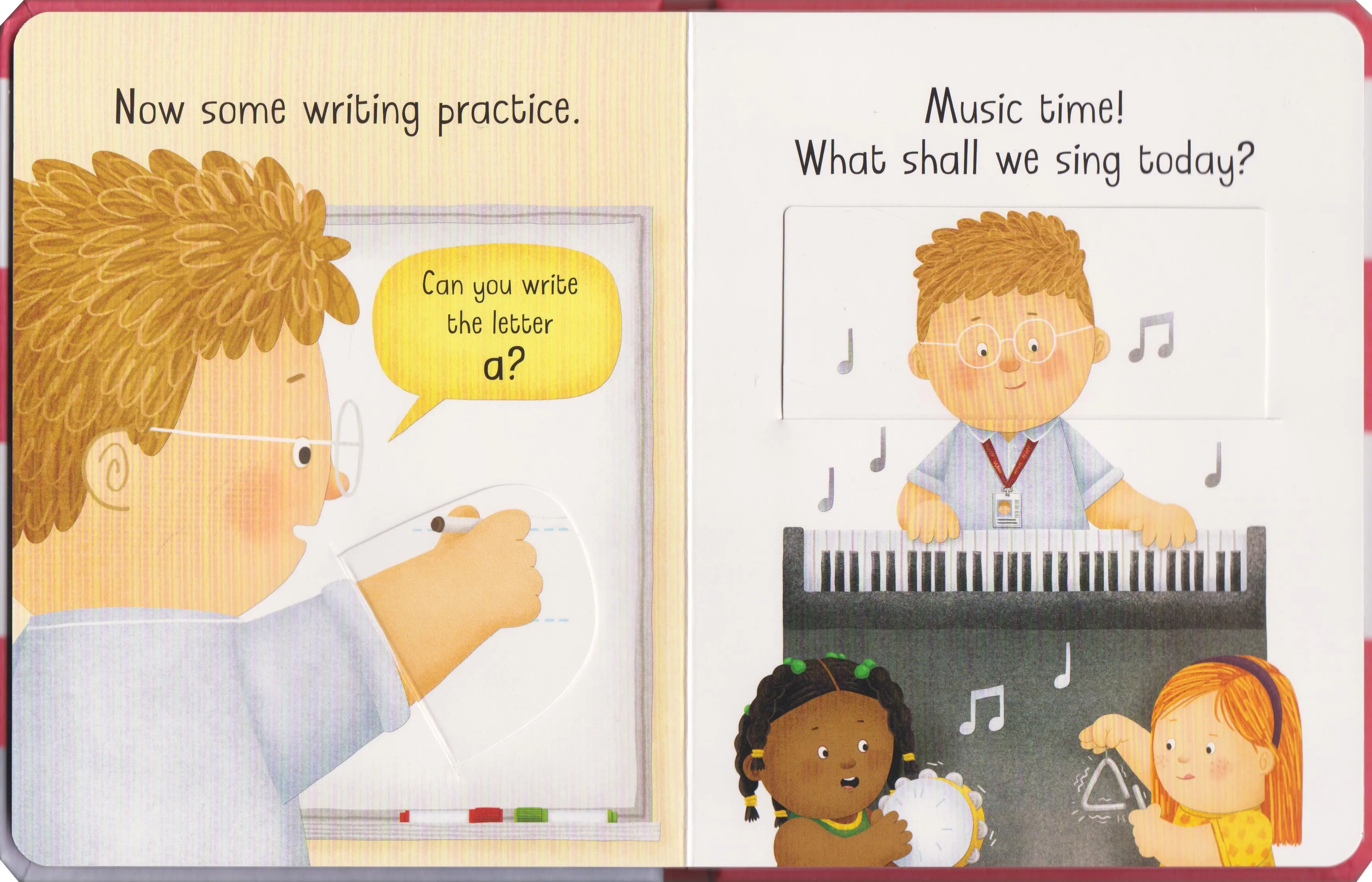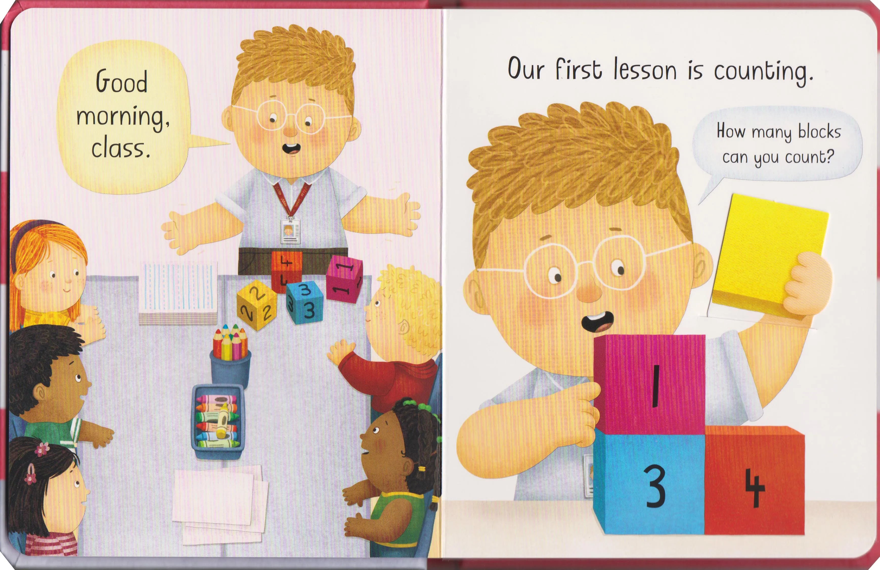 Разом із книгою малюки можуть допомогти учителю організувати день у класі. Вони будуть рахувати блоки, написати на дошці, прочитають історію класу та виконуватимуть інші завдання. Інтерактивні сторінки з рухомими елементами залучають дитину до участі в грі, формують логічне мислення та покращують уважність.