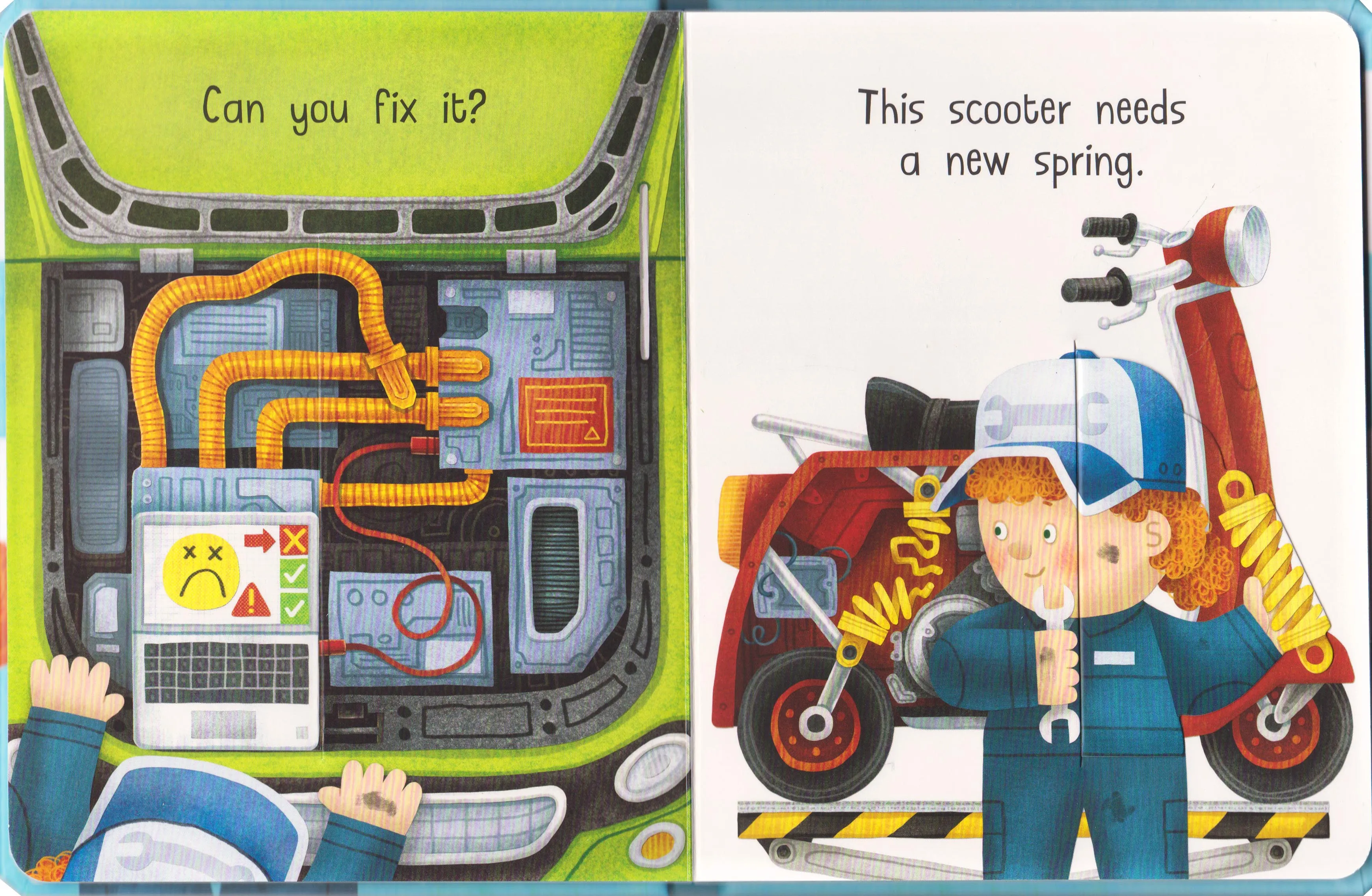 Can you help the busy mechanic to fix the monster truck? Join in and use the flaps to mend the car, put on a new wheel, and fill up the engine. With interactive action-flaps, you can do it, too!Each clever flap provides an action or scene-change to encourage children to actively engage and explore. The playful flaps are perfect for little hands to develop fine motor skills and hand-eye coordination.