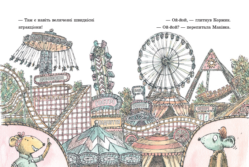 Історія розповідає про двох мишок Коржика та Маківку. Маківка любить фільми жахів. Коржик – ні. Маківка обожнює тягучий сир. А Коржик – ні. Маківці не терпиться покататися на атракціонах. А Коржик…може й потерпіти. Попри все, Коржик і Маківка – найкращі друзі. Тож коли до їхнього міста приїхав парк розваг, Коржик погоджується туди піти. Ігри та призи, смаколики, швидкісні атракціони, – що нового спробують мишенята?
