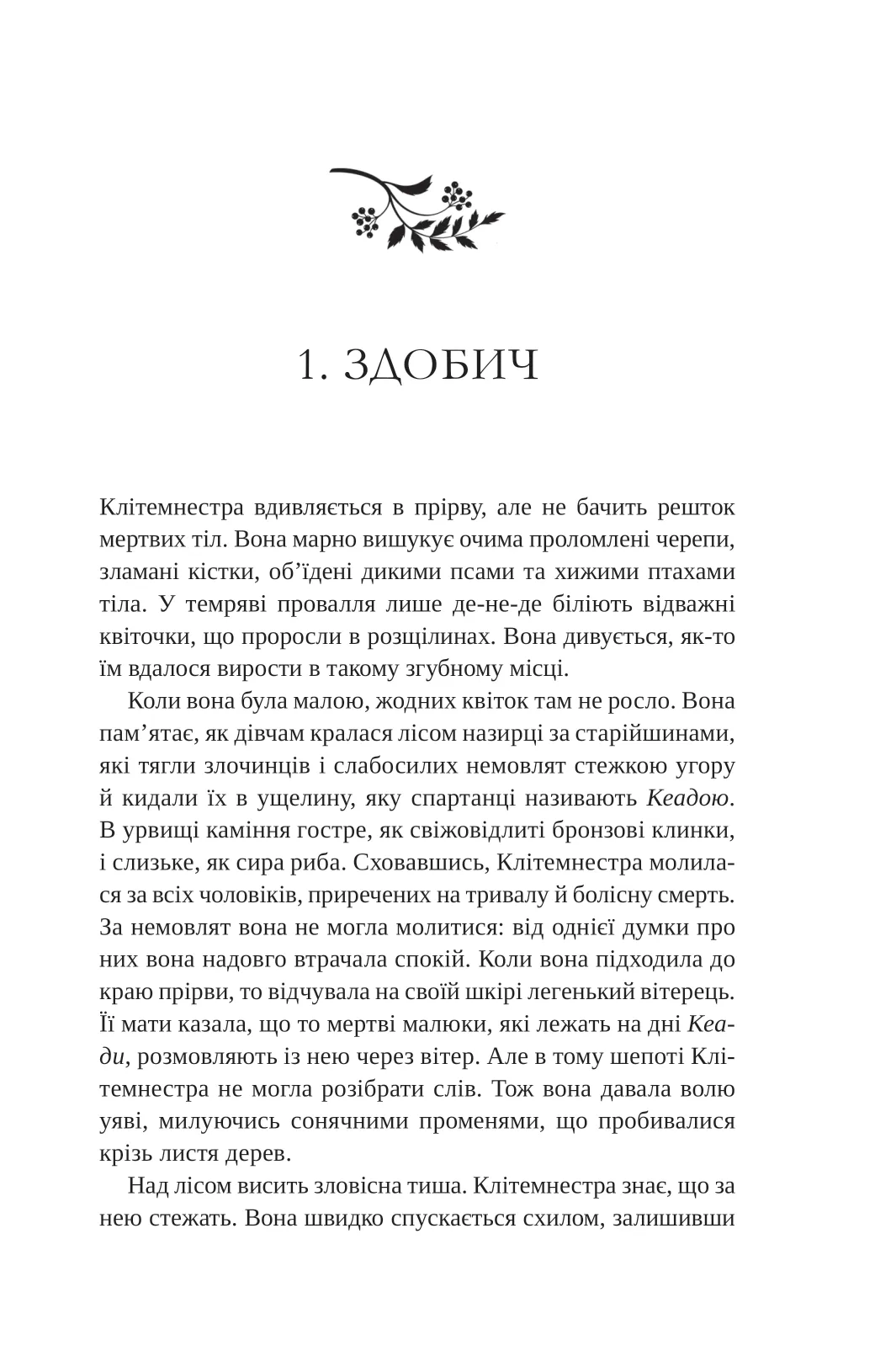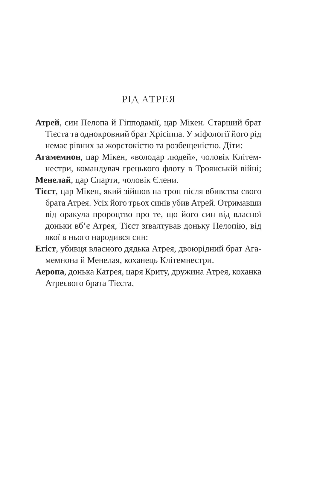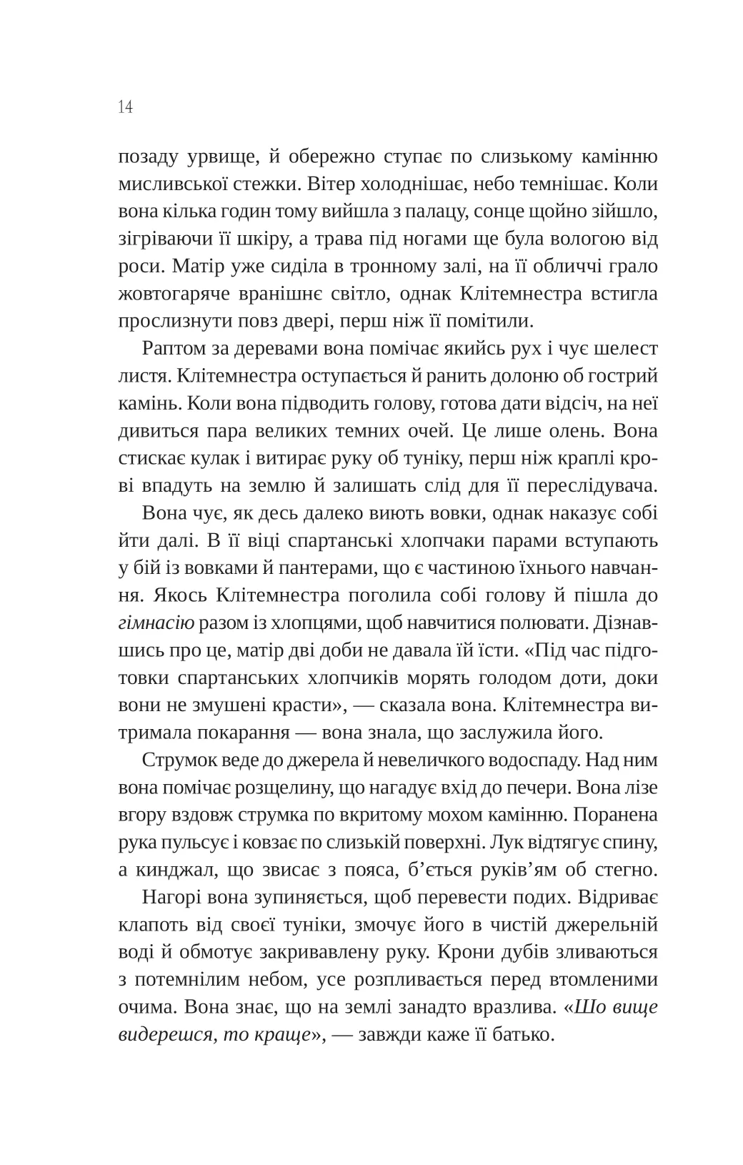 Клітемнестра народилась у царській родині, але вийшла заміж за тирана. Безсилою спостерігала, як він приносить у жертву їхню дитину, аби задобрити богів. Дивилася, як він веде війну на чужині, і втішала себе жорстокими думками. Це було не те життя, на яке вона заслуговувала.