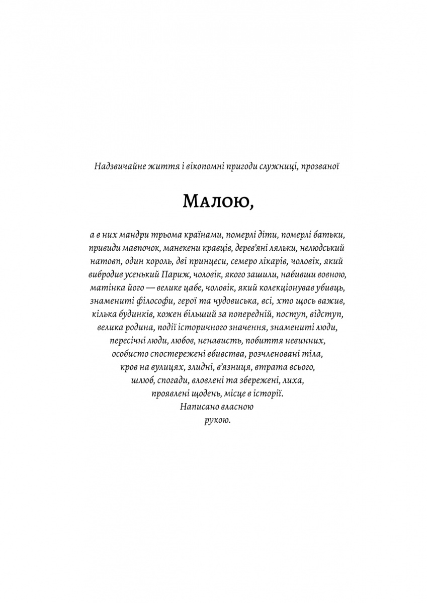 Роман Мала — це похмура, та водночас надзвичайно глибока історія про силу мистецтва, класові бар'єри, винахідливість та вистраждану рішучість. Автор книги — Едвард Кері, знаний майстер магічного реалізму, чия творчість викликає асоціації з Тімом Бертоном, Генрі Селіком, Бруно Шульцом та Едвардом Ґорі.