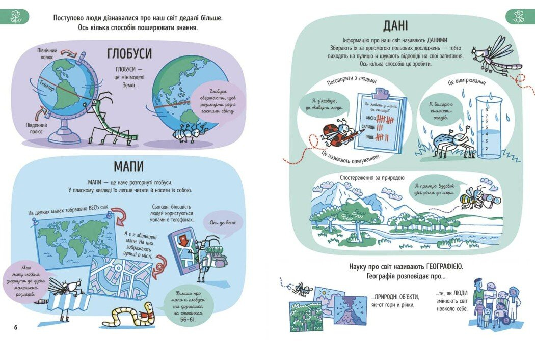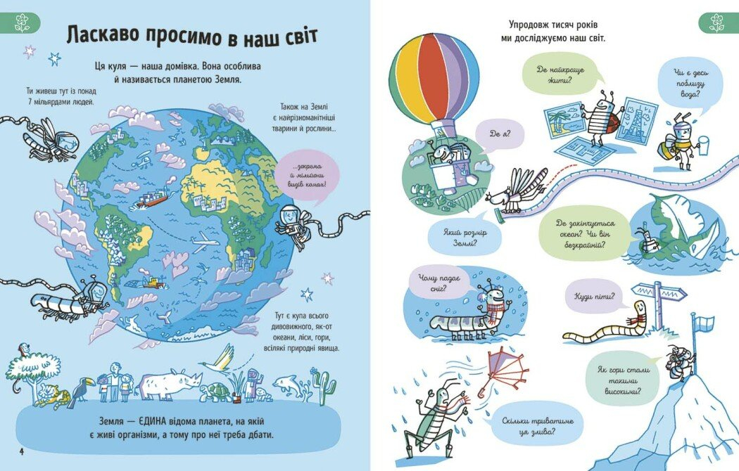 Усе це подано у формі коротких інформаційних блоків, адаптованих під дитяче сприйняття, з інтерактивними запитаннями та яскравими ілюстраціями, які збуджують цікавість і спонукають до подальшого вивчення світу.