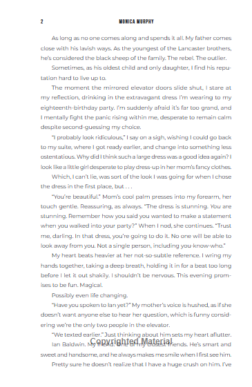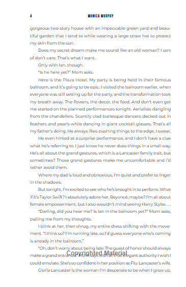 The main heroine of the novel is young heiress Scarlett Lancaster. Her birthday promises to be unforgettable, as her father hires a famous pop singer to perform at her party. Unfortunately, it’s not Harry Styles, but Tate Ramsey—the former frontman of a long-forgotten boy band, recently returned from years of fame, wild living, and rehab.