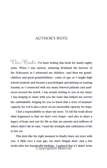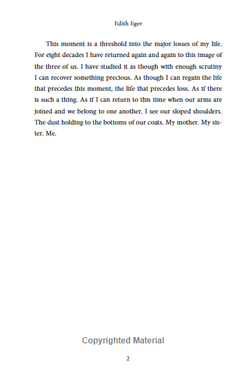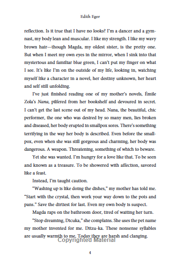 У цьому новому творі Едіт відтворює трагічні події своєї юності, пропускаючи їх крізь призму особистих спогадів, думок і переживань. Читачі мають змогу зануритися у світ юної дівчини, яка попри жахи нацистського режиму зберегла світло мрії про танець і життя. Це не лише пригадування пережитого, а й потужний акт зцілення, що надихає інших знаходити внутрішню силу навіть у найтемніші моменти.