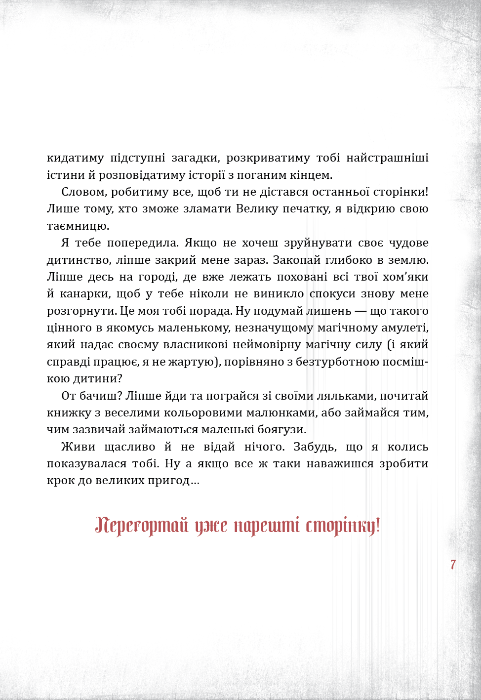 Рада тут одна: роздерти книжку на шматки; втопити в океані; або віддати сусідові, якого не любиш. Та в жодному разі не розгортати цієї книжки! Ця книжка дуже зла, а кожна її сторінка… може стати останньою у твоєму житті!