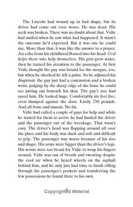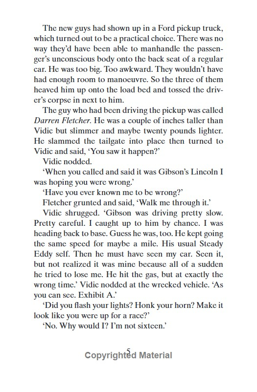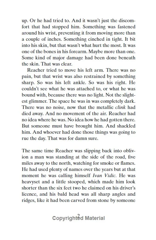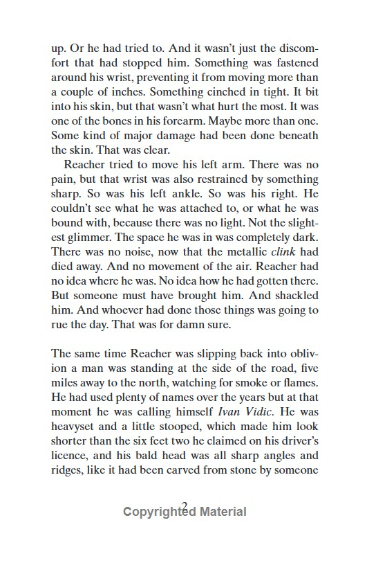 Reacher had no idea where he was. No idea how he had got there. But someone must have brought him. And shackled him. And whoever had done those things was going to rue the day. That was for damn sure.Jack Reacher wakes up, alone, in the dark, handcuffed to a makeshift bed. His right arm has suffered some major damage. His few possessions are gone. He has no memory of getting there.The last thing Reacher can recall is the car he hitched a ride in getting run off the road. The driver was killed.His captors assume Reacher was the driver's accomplice and patch up his wounds as they plan to make him talk.A plan that will backfire spectacularly . . .