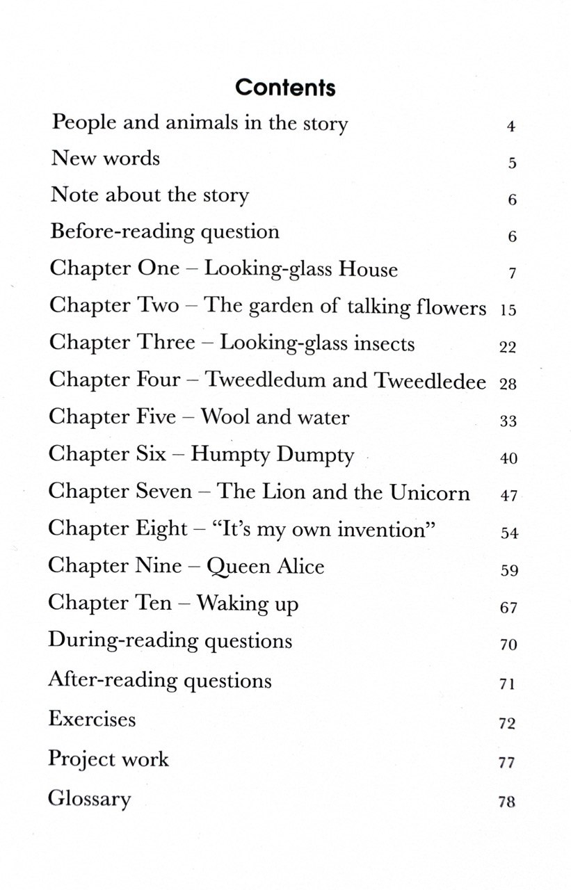 Alice Through the Looking Glass (Аліса в Задзеркаллі) — книга рівня 3, що відповідає рівню A2 за шкалою CEFR. Текст складається з речень до трьох частин і знайомить із першим типом умовних речень, минулим тривалим часом та теперішнім доконаним часом для загального досвіду. Більшість сторінок супроводжуються яскравими ілюстраціями.