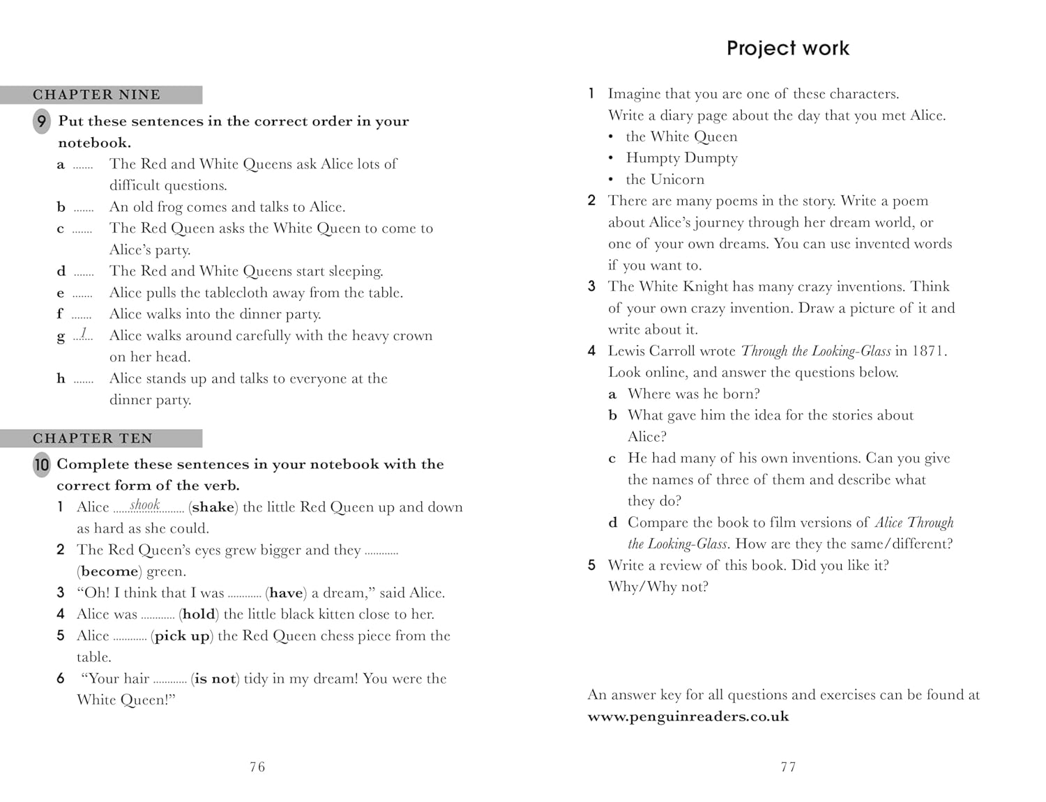 With carefully adapted text, new illustrations, language practise activities and additional online resources, the Penguin Readers series introduces language learners to bestselling authors and compelling content. Titles include popular classics, exciting contemporary fiction, and thought-provoking non-fiction.Alice Through the Looking Glass, a Level 3 Reader, is A2 in the CEFR framework. The text is made up of sentences with up to three clauses, introducing first conditional, past continuous and present perfect simple for general experience. It is well supported by illustrations, which appear on most pages.Alice is playing with her kitten when she begins to feel tired. Suddenly the looking-glass moves and changes color. Alice steps through the glass into a magic world. It is even stranger than Wonderland... what might she find there?