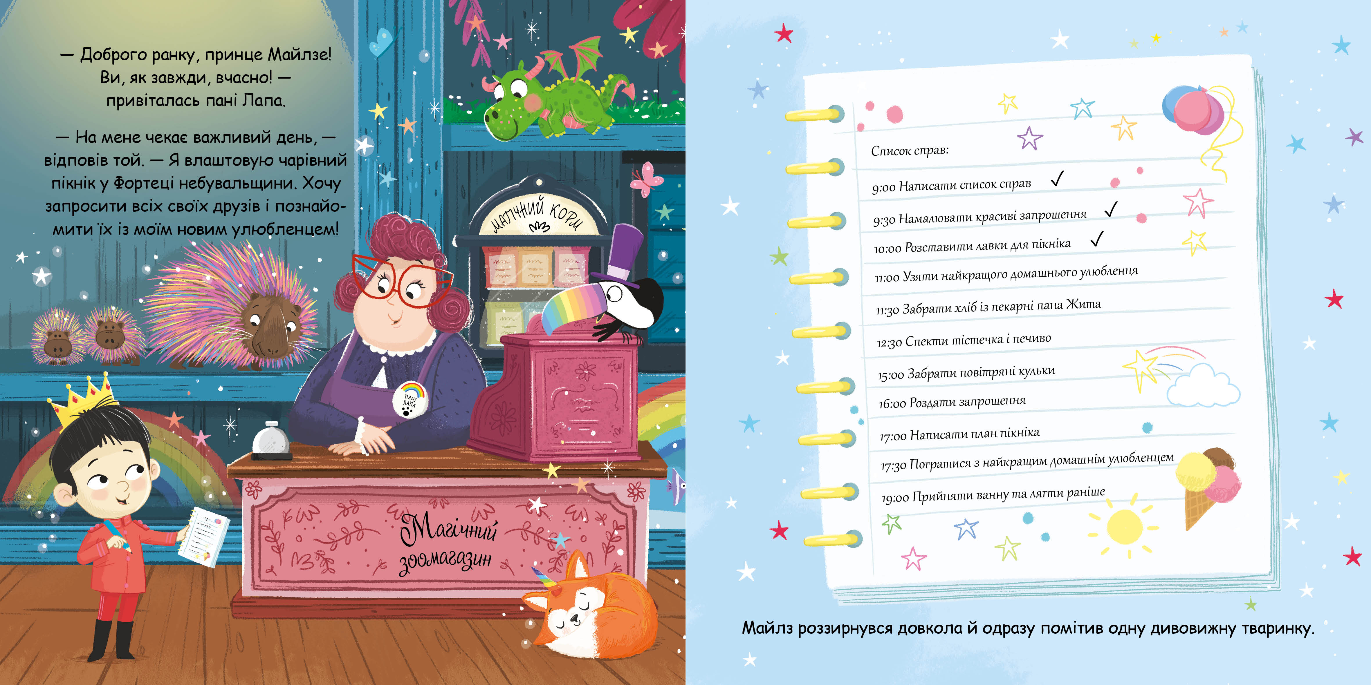 Принц Майлз має багато обов’язків і завдань. Він готує казковий пікнік і довіряє лише перевіреним спискам справ. Але з появою Которіжки все змінюється — невчасні пригоди, переплутані плани і… надзвичайні враження! Чи зможе наш герой відкрити серце новим враженням і подивитися на життя по-новому? Це дізнаються юні читачі на сторінках книжки.