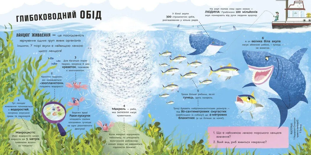 Маленькі дослідники дізнаються, що таке підводні ліси, якими бувають мегазграї дельфінів і чим особливі акули-лисиці. Книга також пояснює природні явища у зрозумілий спосіб, спонукаючи дитину самостійно пізнавати світ. Усе це — у форматі легких пригод разом із доброзичливими акулами!