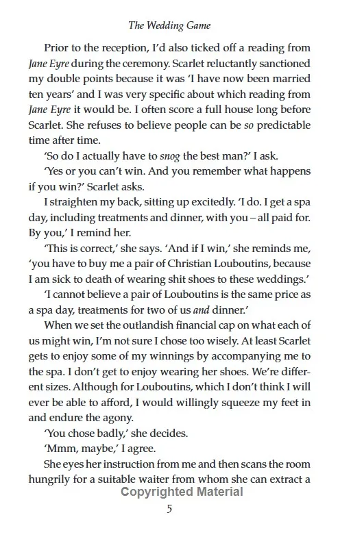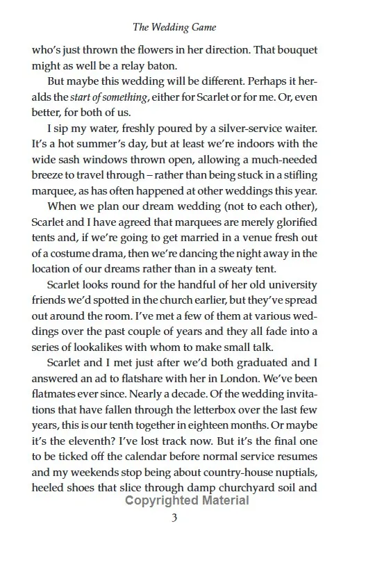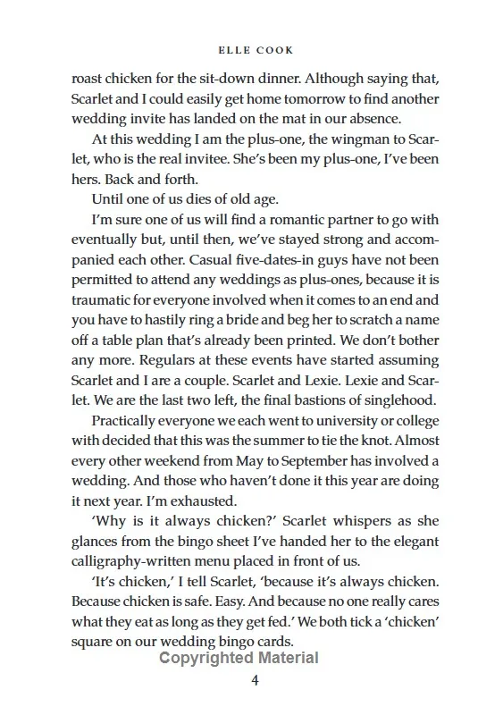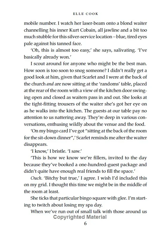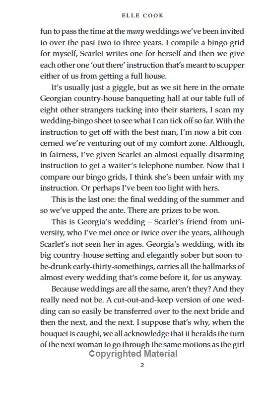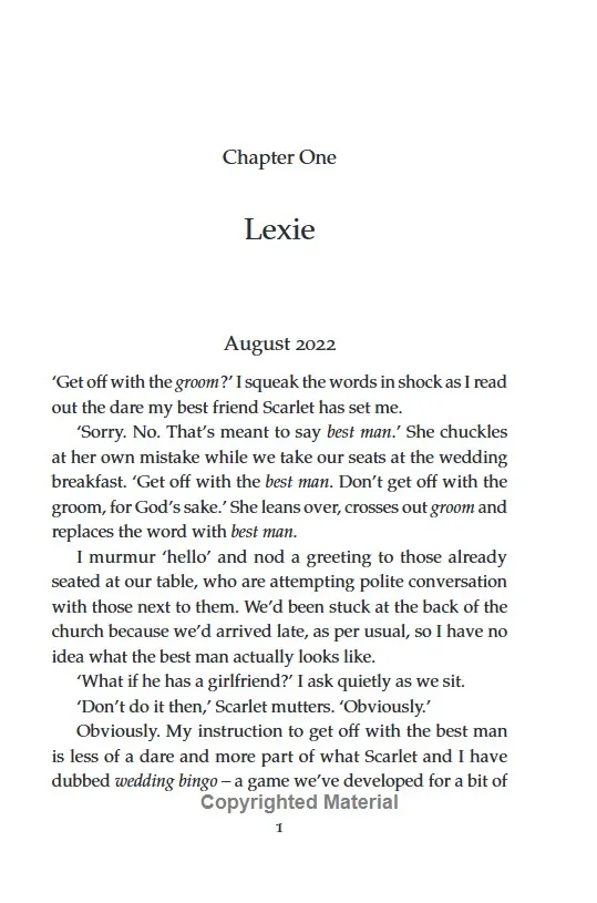 It started as a dare…Best friends Lexie and Scarlet are attending their ninth – or is it tenth? – wedding this summer. To keep things fresh, they've upped their game. With bingo. To win, all Lexie must do is complete her scorecard first.A tipsy bridesmaid? Tick!An awkward best man's speech? Tick!A terrible DJ? Tick!And finally: Kiss a groomsman…But Lexie hasn't gambled on finding not one but two gorgeous groomsmen. Chris, tall, dark and handsome – and leaving for New York tonight – and charmingly rugged farmer Josh.True love could be on the cards. If Lexie can make the right choice, right now…