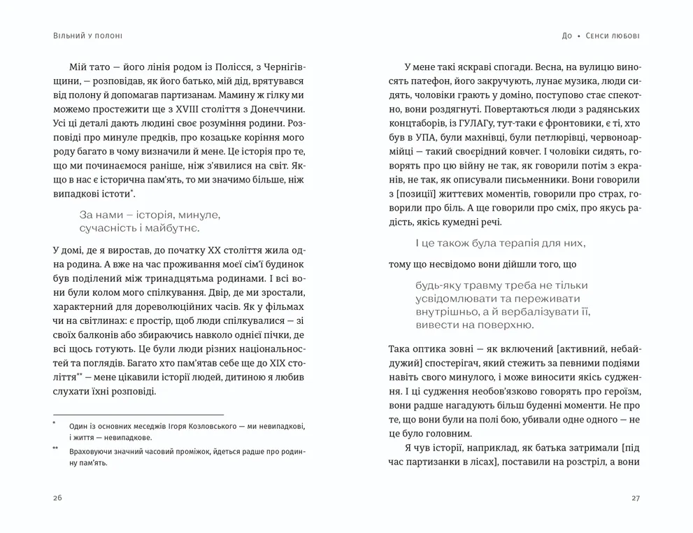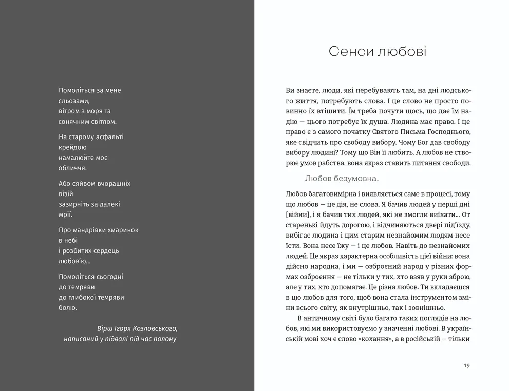 Ця книжка не є монологом, складеним з різних інтерв’ю, а навпаки — це діалог з читачем, жива розмова з кожним. А ще — нагода поговорити про важливе, подумати, помовчати, знайти відповіді на власні питання й наснажитися мудрим словом Ігоря Козловського.