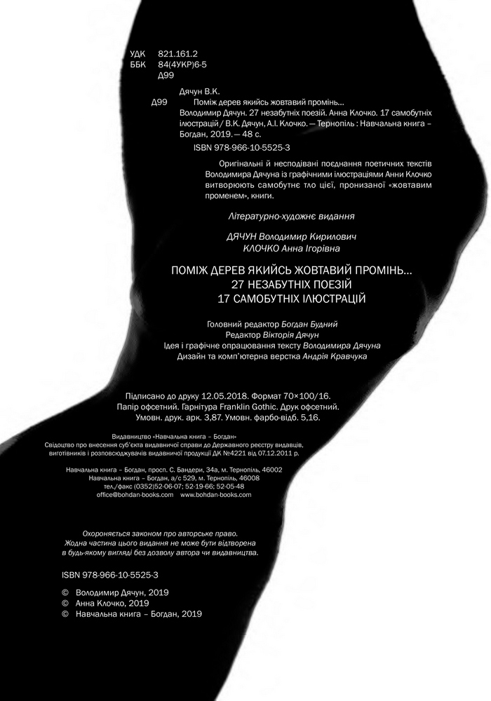 Оригінальні й несподівані поєднання поетичних текстів Володимира Дячуна із графічними ілюстраціями Анни Клочко витворюють самобутнє тло цієї, пронизаної «жовтавим променем», книги.