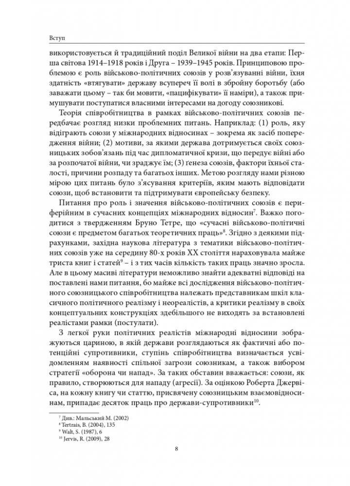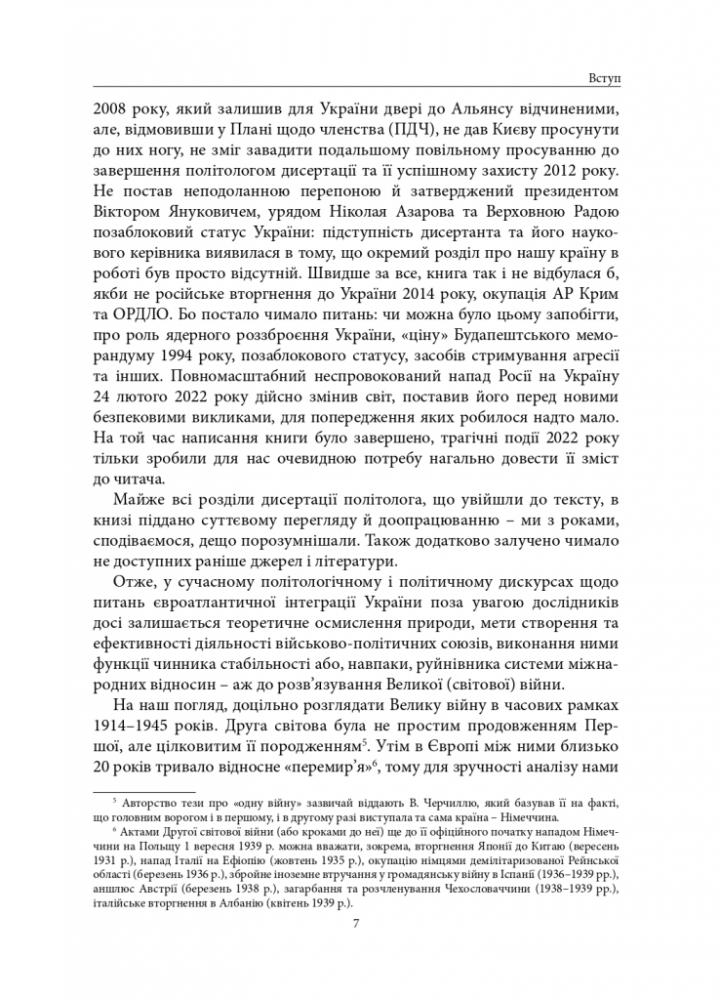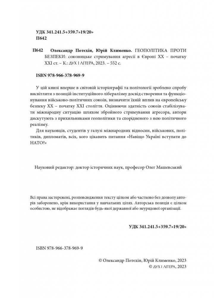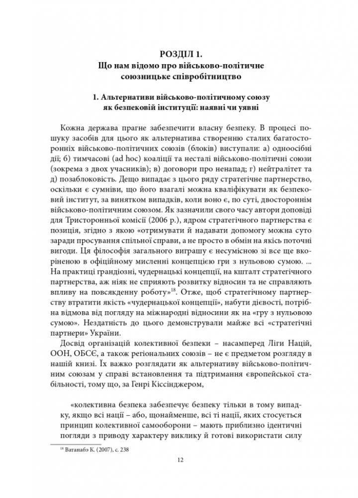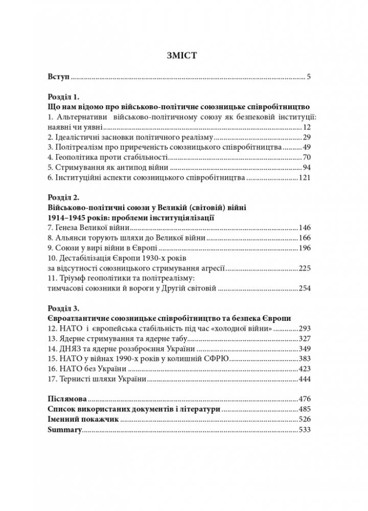 У цій книзі вперше в світовій історіографії та політології зроблено спробу висвітлити з позицій інституційного лібералізму досвід створення та функціонування військово-політичних союзів, визначити їхній вплив на європейську безпеку ХХ – початку ХХІ століття. Оцінюючи здатність союзів стабілізувати міжнародну ситуацію шляхом збройного стримування агресора, автори дискутують з прихильниками геополітики та спорідненого з нею політичного реалізму. Для науковців, студентів у галузі міжнародних відносин, військових, політиків, дипломатів, всіх, кого цікавить питання «Навіщо Україні вступати до НАТО?» Науковий редактор: доктор історичних наук, професор Олег Машевський