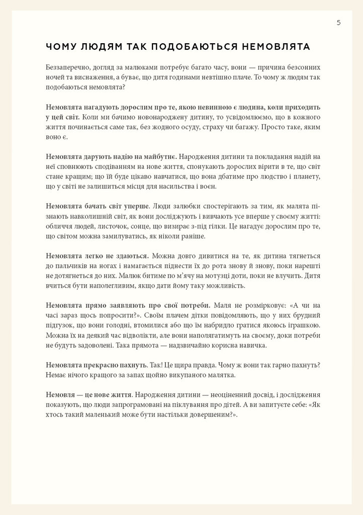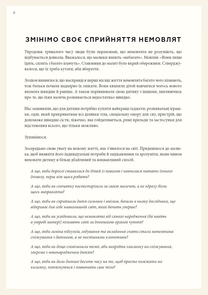 Колись вважалося, що новонароджені не здатні активно сприймати навколишній світ, однак сучасні дослідження доводять протилежне. У своїй книзі Симона Дейвіс розповідає, як з перших днів допомогти немовляті розвиватися самостійно. Вона закликає не нав'язувати дитині штучні сценарії розвитку, а створити безпечне, просте і естетичне середовище, яке пробуджує інтерес до пізнання.