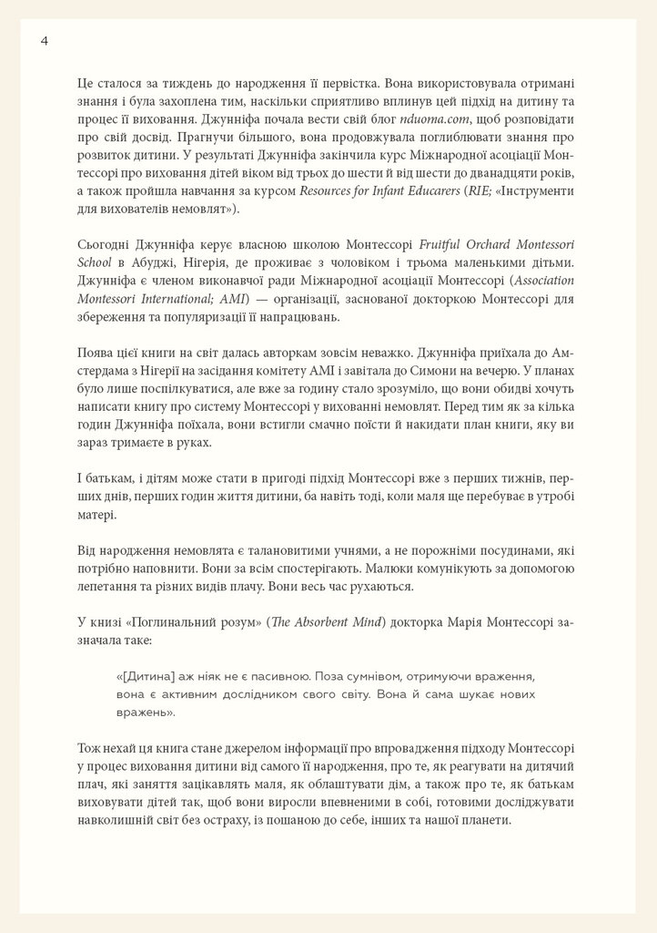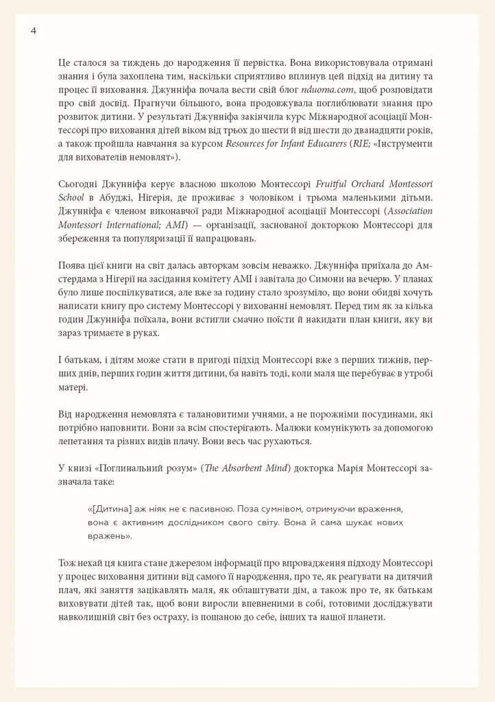 Книга Монтессорі для немовлят. Як виховувати дитину з любов’ю, повагою та розумінням — це цінний ресурс для молодих батьків, вихователів і педагогів, які прагнуть створити сприятливе середовище для гармонійного розвитку дитини з перших днів життя. Авторка Симона Дейвіс — відома дослідниця методики Монтессорі, педагог і мати двох дітей. Вона присвятила свою кар'єру впровадженню філософії Марії Монтессорі у сучасне батьківство.