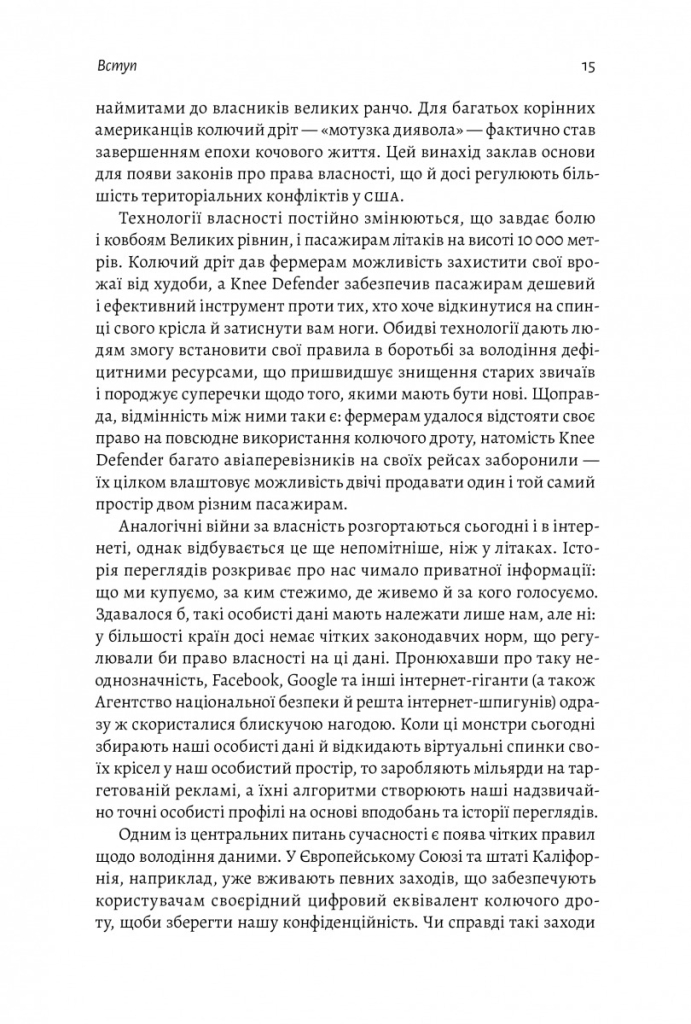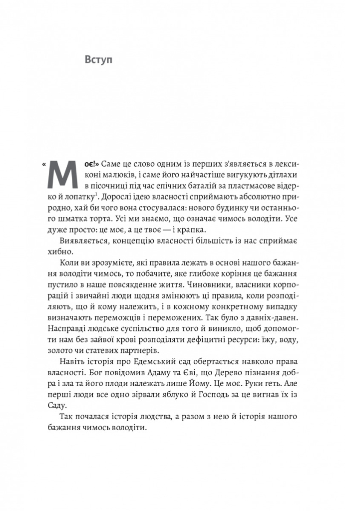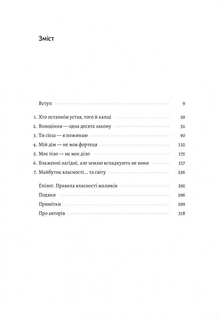 Зазвичай ми не замислюємося над тим, що ж насправді означає слово «моє». З дитинства ми вчимося розрізняти своє та чуже, однак Геллер і Зальцман доводять: концепція власності — це далеко не очевидна істина, а складна взаємодія правил, норм і домовленостей. У книзі автори розповідають, кому насправді належить певний предмет, простір або навіть ідея, і чому це настільки важливо для нашого життя і мислення.