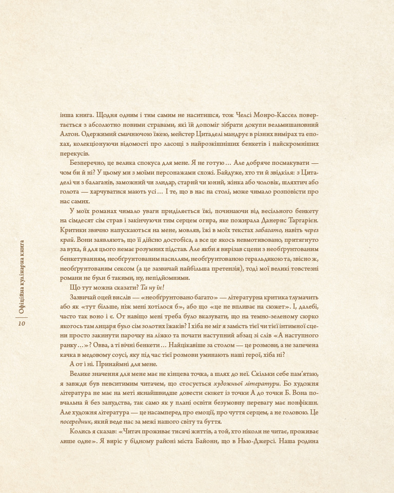Книга Гра престолів. Офіційна кулінарна книга — це справжній гастрономічний скарб для шанувальників епічної саги Джорджа Р. Р. Мартіна та серіалу, створеного за її мотивами. Автором видання є Челсі Монро-Кассел, експерт з фентезійної кухні, яка перенесе вас у величний світ Семи Королівств за допомогою 80 неймовірно оригінальних рецептів.