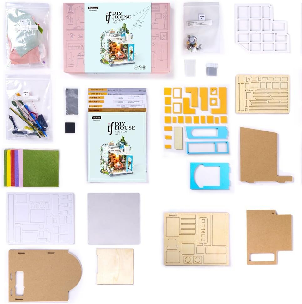 У наборі ви знайдете всі необхідні матеріали для складання кімнати: деталі з дерева, тканини, пластику, а також інструкцію з покроковими малюнками. Не потрібно шукати складні інструменти — у наборі вже є все необхідне, включаючи клей і LED-підсвітку. Деякі моделі також містять мініатюрні книги, вазони, посуд і картини.